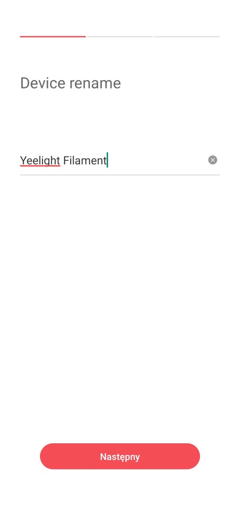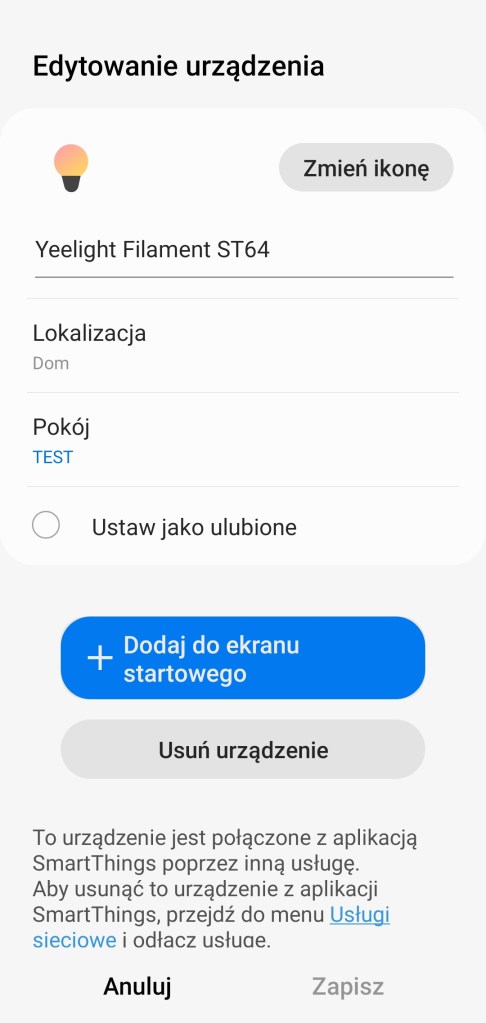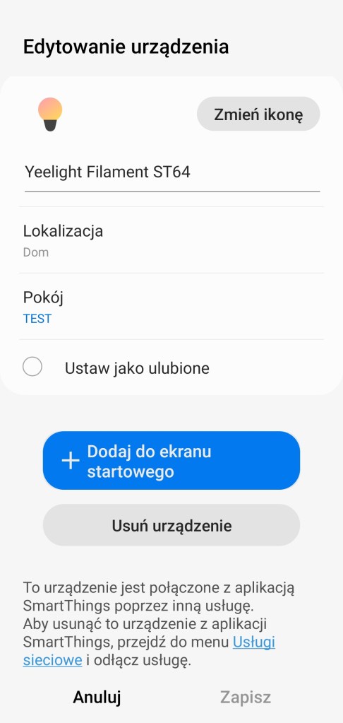 Po dodaniu urządzeń w aplikacji Yeelight, możemy przystąpić do połączenia usług Yeelight i SmartThings. Przechodzimy do aplikacji SmartThings, aby dodać urządzenie do inteligentnego domu. Klikamy na ekranie głównym przycisk Dodaj ( + ), w prawym górnym rogu ekranu. Następnie Urządzenie, przesuwamy w dół do sekcji marek Wybór z listy urządzeń, wybieramy markę Yeelight, a później Oświetlenie. Kontynuujemy pierwsze kroki, wybierając lokalizację i pokój dla urządzenia. Zostaniemy poproszeni o zalogowanie się do konta Xiaomi. Po zalogowaniu wyświetli się komunikat o poprawnym połączniu między producentami, zamykamy stronę poprzez kliknięcie ( x ) w lewym górnym rogu. Po chwili ukaże się lista, wszystkich urządzeń, dodanych wcześniej do aplikacji Yeelight, w tym Yeelight Filament, kończmy proces stukając Gotowe. W późniejszym etapie zmieniliśmy jej nazwę na Yeelight Filament ST64.