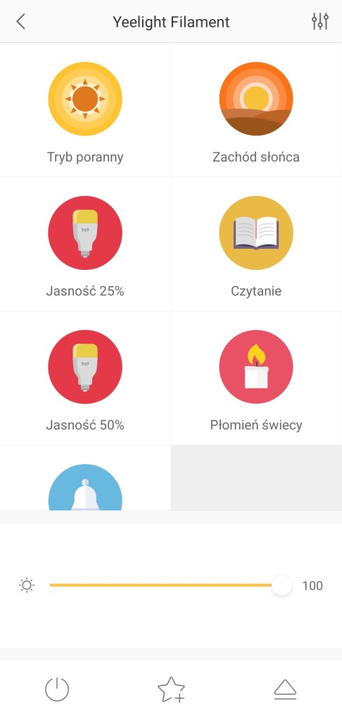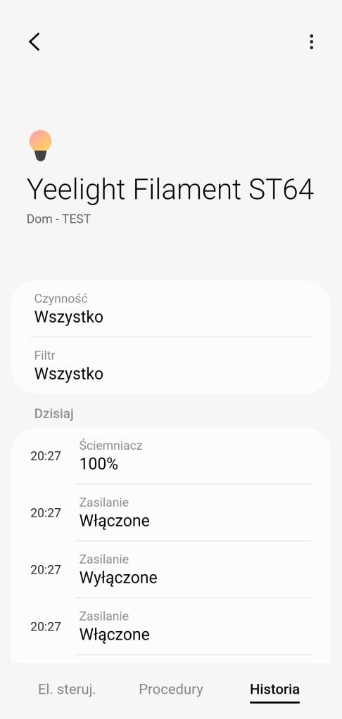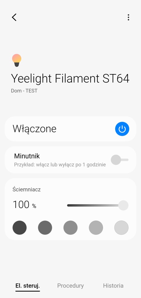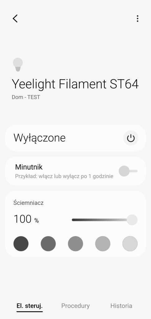 W głównym panelu aplikacji mamy możliwość włączenia/wyłączenia żarówki Yeelight, zaprogramowania szybkich automatyzacji: włączenia i wyłączenia żarówki LED oraz np. minutnika. Żarówka posiada tylko jedną temperaturę barwową więc dostępna jest tylko opcja ustawienia ściemniacza od 1 do 100%. Pod ściemniaczem posiadamy również 5 kół, będących przyciskami ustawiającymi ściemniacz na kolejno od lewej 10%, 30%, 50%, 70% oraz 90% jasności. Na dole znajdziemy sekcję panel „Procedury” (dawniej „Automatyzacje„) znajdziemy tutaj szybkie procedury: włączenia i wyłączenia żarówki o danej porze dnia oraz listę procedur gdzie używane jest urządzenie. Panel „Historii” również nie różni się znacznie od innych urządzeń, mamy dostęp do sortowania i przestudiowania historii działań żarówki. W ustawieniach „Edytuj” mamy standardową możliwość zmiany nazwy, ikony urządzenia, lokalizacji, pokoju, możliwość dodania do panelu „Ulubione”. oraz informację, że urządzenie jest połączone poprzez inną usługę, w tym wypadku Yeelight.