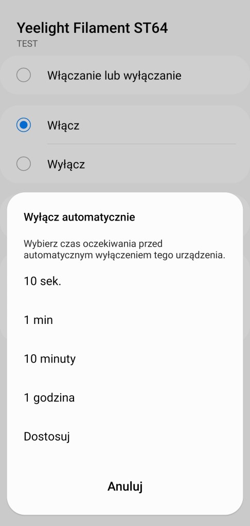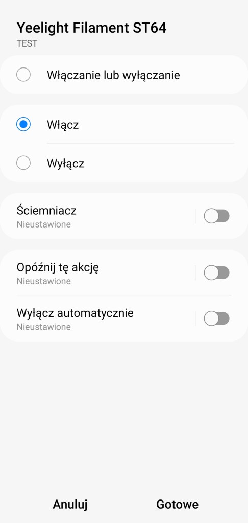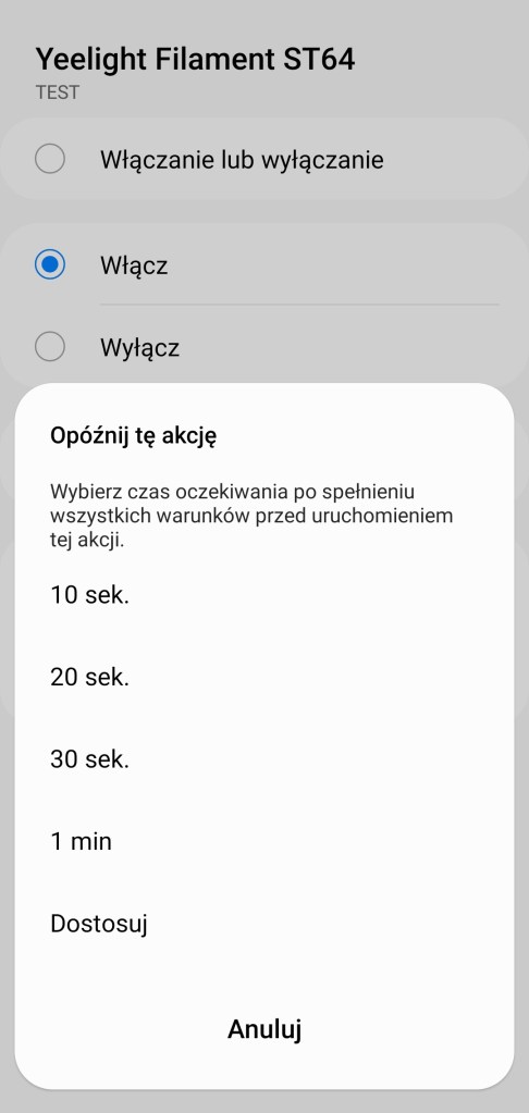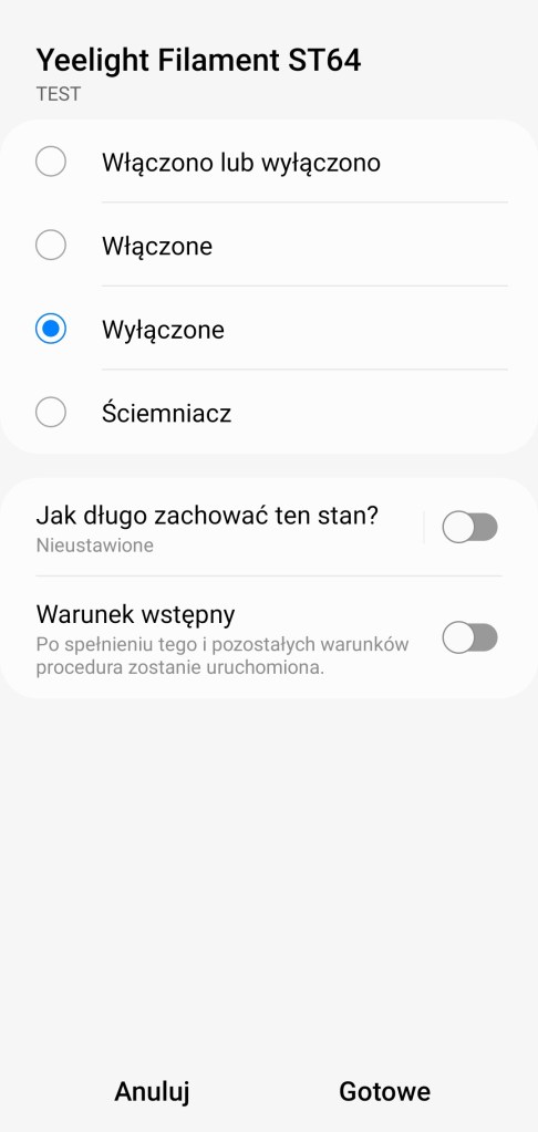 Tworzenie automatyzacji „Jeśli … to Wtedy” musimy podzielić na dwa etapy, ponieważ znacznie się różnią. W pierwszej możliwości „Jeśli” urządzenie pozwala na wybranie opcji „Włączono lub wyłączono” czyli zmiana stanu, oraz „Włączone” i „Wyłączone”, w tym czas jak długo ma być zachowany ten stan oraz wartość ściemniacza, w zakresie 1 – 100%. Określić czy ma być to warunek wstępny. W drugiej możliwości „Wtedy”, żarówka pozwala na ciut więcej, ponownie mamy opcje „Włączono lub wyłączono” czyli zmiana stanu, oraz „Włączone” i „Wyłączone”. Ustawienie jasności żarówki z zakresu 1 – 100%. Akcję uruchomienia możemy opóźnić o dowolny czas, jak i wyłączyć automatycznie po ustalonym czasie.