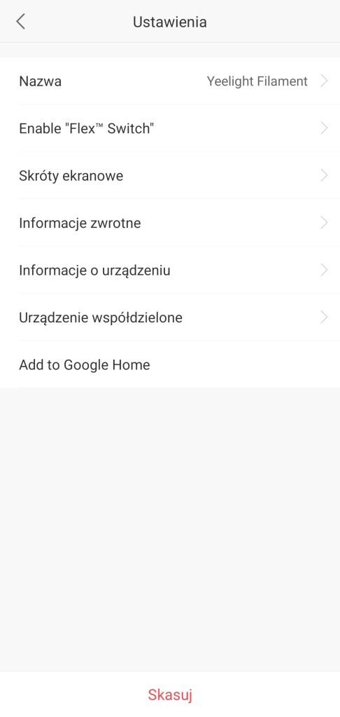 Aby uniknąć ponownego wyszukania urządzenia przez aplikację SmartThings, należy również usunąć żarówkę z aplikacji Yeelight. W tym celu otwieramy aplikację Yeelight, przechodzimy do głównego panelu starowania żarówki. Przechodzimy do ustawień (prawy górny róg). Na dole klikamy Skasuj a następnie potwierdzamy Ok.