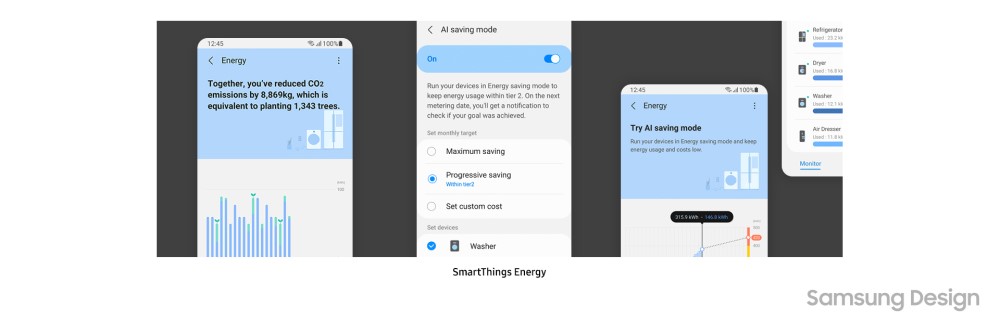 SmartThings Energy pozwala użytkownikom przejąć kontrolę nad zużyciem energii, dostarczając w czasie rzeczywistym szczegółowe i dokładne informacje o tym, gdzie i jak energia jest wykorzystywana w ich domu. Usługa mierzy poziomy energii w kilowatogodzinach i koszty w czasie, dzięki czemu każdy użytkownik może łatwo zrozumieć, ile energii zużywa urządzenie. Aplikacja oferuje również konkretne wskazówki dotyczące zmniejszania zużycia energii i zachęca użytkowników do włączania ekologicznych działań do ich codziennego życia. Ponadto włączenie trybu oszczędzania AI pomaga zmniejszyć zużycie energii, automatycznie przełączając urządzenia w tryb oszczędzania energii po osiągnięciu określonego zużycia energii.