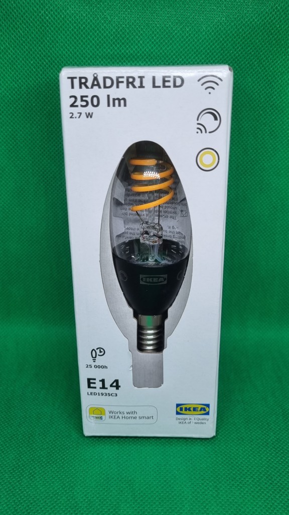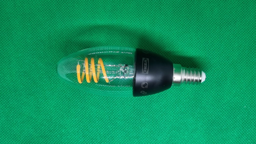 IKEA TRÅDFRI to żarówka LED w kształcie klasycznej świeczki i małym gwintem E14. Ma ona stałą barwę światła na poziomie 2200 kelwinów dającą barwę ciepłą. Dodatkowo posiadamy tylko możliwość ściemniania w zakresie 0 – 100%. Żarówka daje maksymalną jasność na poziomie 250 lm, co jest bardzo małym wynikiem. Komunikacja odbywa się po protokole Zigbee, bezpośrednio z centralą SmartThings. Moc znamionowa na poziomie 2,7W, co daje 92 lm na wat (odpowiednik tradycyjnej żarówki 25W). Zużycie prądu w trybie czuwania to 0,3W. Żywotność to aż 25 000 godzin oraz 25 000 cyklów przełączania. Posiada klasę energetyczną A++, co przekłada się na nową na poziomie F. Zużycie energii przez źródło światła w trybie włączonym 3 kWh/1000 godz. Wysokość to standardowo 11,3 cm, a średnica 3,8 cm. Żarówka może być używana w temperaturach od -20° C do + 40° C.