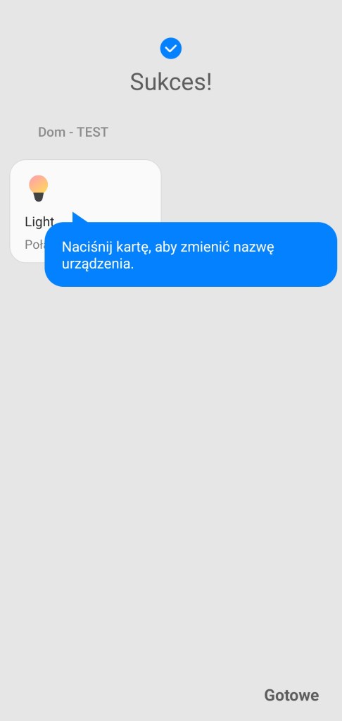 Dodanie do ekosystemu jest proste należy postępować zgodnie z instrukcją w aplikacji SmartThings. Klikamy na ekranie głównym przycisk Dodaj ( + ), w prawym górnym rogu ekranu. Następnie Urządzenie, przesuwamy w dół do sekcji marek Wybór z listy urządzeń, wyszukujemy markę IKEA, wybieramy Oświetlenie, z dostępnej listy wybieramy IKEA. Kontynuujemy pierwsze kroki, wybierając centralę i pomieszczenie, w jakim ma się zaleźć urządzenie. Następnie szybko włączamy i wyłączamy zasilanie żarówki 6 razy. Po dodaniu do ekosystemu żarówka LED przestanie migać. Pomyślnym dodaniu możemy zmienić nazwę, co myśmy uczynili zmieniając na „IKEA świeczka retro”. Kończymy proces instalacji, klikając Gotowe.