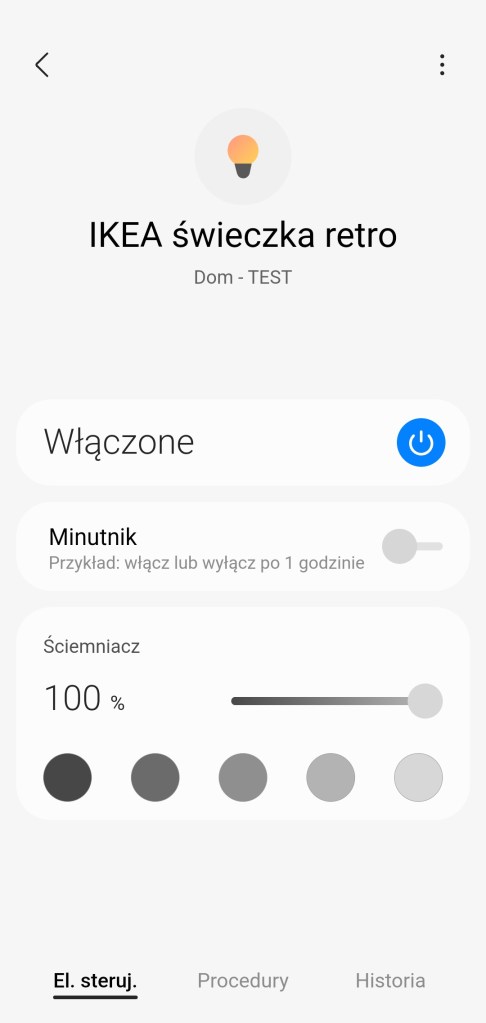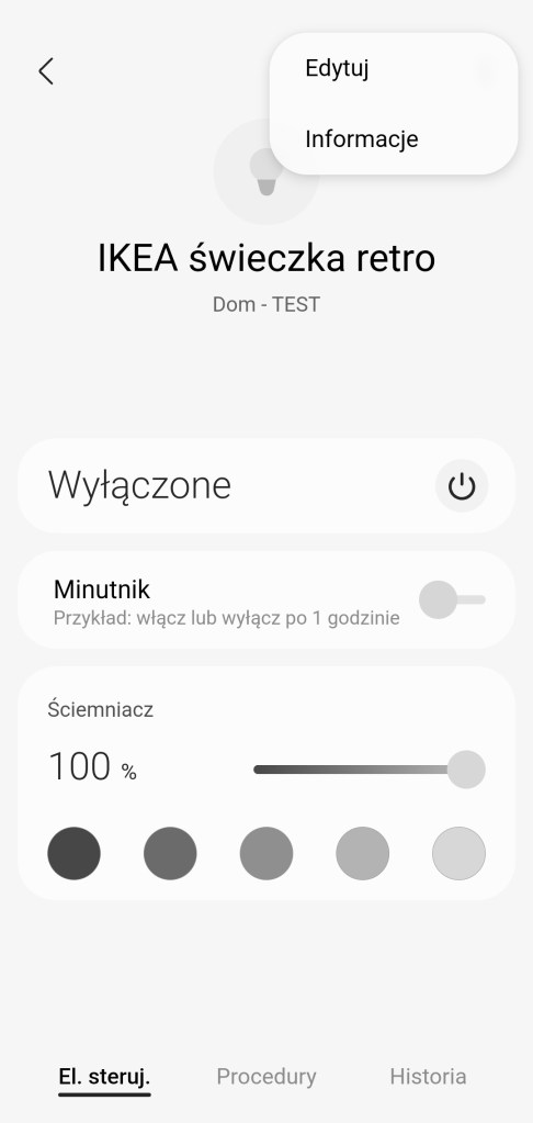 W głównym panelu urządzenia mamy możliwość włączenia/wyłączenia żarówki IKEA oraz możliwość ustawienia minutnika. Poniżej posiadamy możliwość ustawienia ściemniacza od 1 do 100%. Pod ściemniaczem posiadamy również pięć kół, będących przyciskami ustawiającymi ściemniacz na kolejno od lewej 10%, 30%, 50%, 70% oraz 90% jasności. Na dole znajdziemy sekcję panel „Procedury” (dawniej „Automatyzacje„) znajdziemy tutaj szybkie procedury: włączenia i wyłączenia żarówki o danej porze dnia oraz listę procedur gdzie używane jest urządzenie. Panel „Historii” nie różni się znacznie od innych urządzeń, mamy dostęp do sortowania i przestudiowania historii działań żarówki. W ustawieniach „Edytuj” mamy standardową możliwość zmiany nazwy, ikony, lokalizacji, pokoju oraz możliwość dodania do panelu „Ulubione”.
