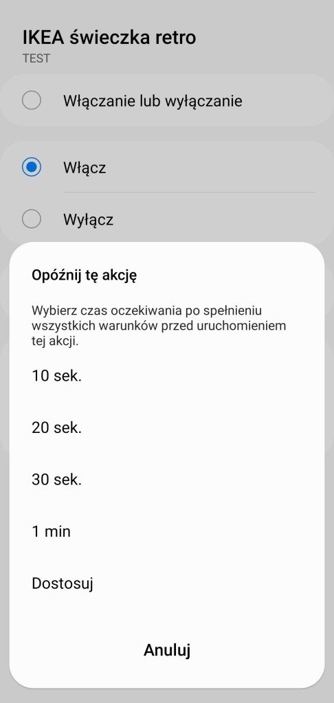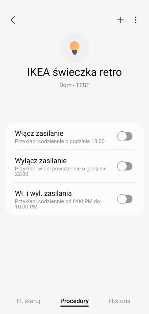 Tworzenie procedur (dawniej automatyzacje) „Jeśli … to Wtedy” musimy podzielić na dwa etapy, ponieważ znacznie różnią się dostępne opcje, jeśli inicjujemy warunek „Jeśli”. W pierwszej możliwości „Jeśli” urządzenie pozwala na wybranie opcji „Włączono lub wyłączono” czyli zmiana stanu, oraz „Włączone” i „Wyłączone”. Dodatkowo posiadamy opcję jak długo zachowany powinien być stan przed uruchomieniem automatyzacji oraz czy ma być to warunek wstępny. W drugiej możliwości „Wtedy”, żarówka pozwala na dużo więcej, mamy ponownie opcje „Włączono lub wyłączono” czyli zmiana stanu, oraz „Włączone” i „Wyłączone”. Ustawienie jednego z poziomów jasności żarówki z zakresu 0 – 100%. Akcję uruchomienia lampy możemy opóźnić o dowolny czas, jak i wyłączyć ją automatycznie po ustalonym czasie.