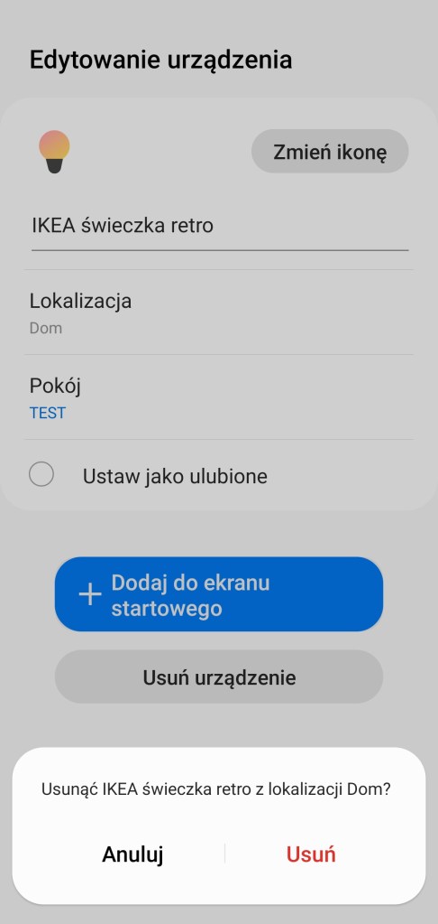 Aby usunąć żarówkę z ekosystemu SmartThings, należy wejść w główny ekran urządzenia. Kliknąć Więcej opcji ( ⋮ ) w prawym górnym rogu ekranu, a następnie Edytuj. W panelu edycji, wybieramy Usuń urządzenie. Następnie potwierdzamy operację, stukając Usuń.