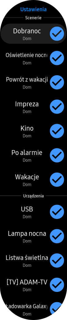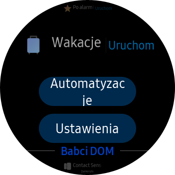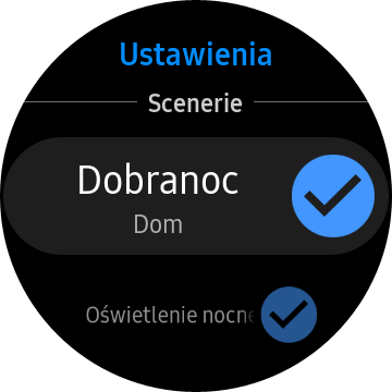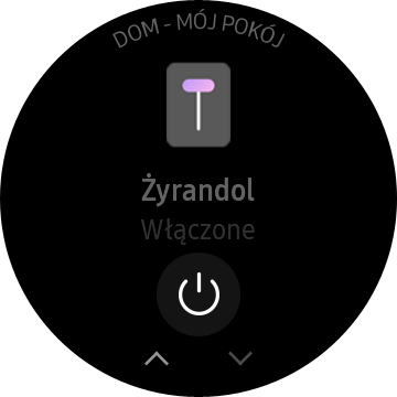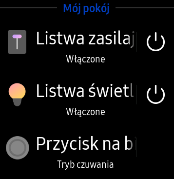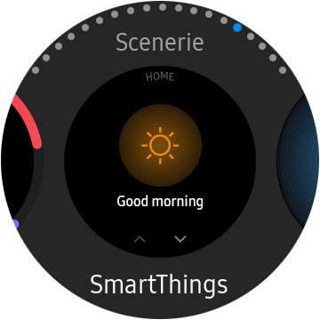 Zegarki Samsunga mają funkcję widgetów, dzięki czemu możemy mieć szybki dostęp do najważniejszych dla nas urządzeń np. oświetlenia czy scenerii. Mamy możliwość wybrania kilku z nich i zmiany wyświetlanego poprzez strzałki u dołu.