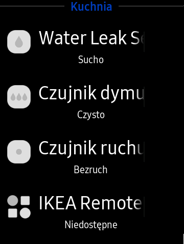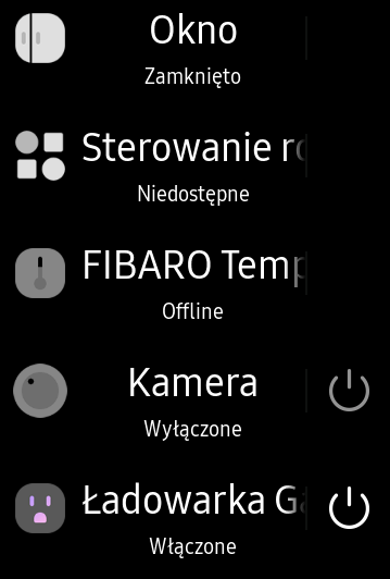 W porównaniu do wcześniejszej wersji aplikacji (1.4.41) nie możemy już wejść do panelu urządzenia. Z listy urządzeń możemy jedynie użyć podstawowej funkcji jak np. włącz/wyłącz lub odtwórz (w przypadku głośnika). Jeśli chodzi o czujniki to możemy podejrzeć jedynie ich główny stan czujnika. Przykładowe urządzenia na liście poniżej.