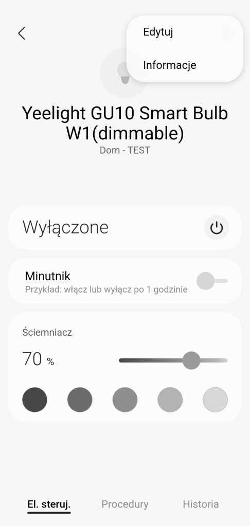 W głównym panelu aplikacji mamy możliwość włączenia/wyłączenia reflektora Yeelight oraz pewną formę minutnika. Żarówka posiada tylko jedną temperaturę barwową więc dostępna jest tylko opcja ustawienia ściemniacza od 1 do 100%. Pod ściemniaczem posiadamy również 5 kół, będących przyciskami ustawiającymi ściemniacz na kolejno od lewej 10%, 30%, 50%, 70% oraz 90% jasności. Na dole znajdziemy sekcję panel „Procedury” (dawniej „Automatyzacje„) znajdziemy tutaj szybkie procedury: włączenia i wyłączenia żarówki o danej porze dnia oraz listę procedur gdzie używane jest urządzenie. Panel „Historii” również nie różni się znacznie od innych urządzeń, mamy dostęp do sortowania i przestudiowania historii działań żarówki. W ustawieniach „Edytuj” mamy standardową możliwość zmiany nazwy, ikony urządzenia, lokalizacji, pokoju, możliwość dodania do panelu „Ulubione”. oraz informację, że urządzenie jest połączone poprzez inną usługę, w tym wypadku Yeelight.