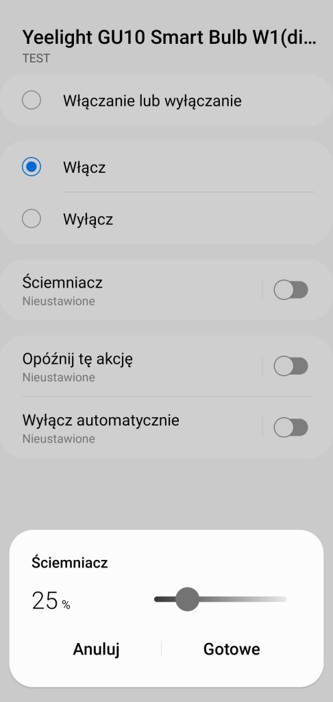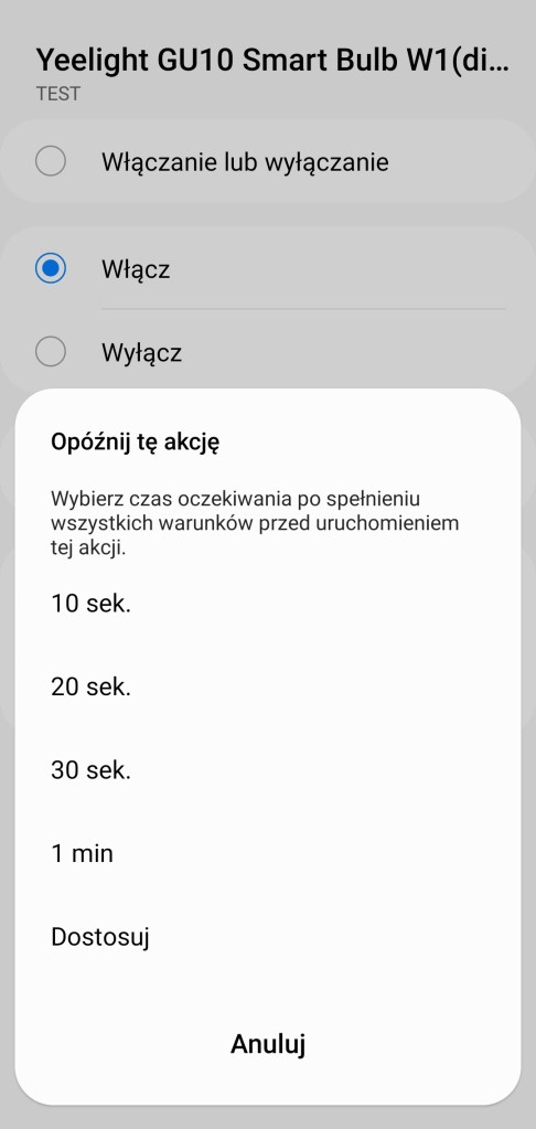 Tworzenie procedur (dawniej automatyzacje) „Jeśli … to Wtedy” musimy podzielić na dwa etapy, ponieważ znacznie się różnią. W pierwszej możliwości „Jeśli” urządzenie pozwala na wybranie opcji „Włączono lub wyłączono” czyli zmiana stanu, oraz „Włączone” i „Wyłączone”, w tym czas jak długo ma być zachowany ten stan oraz wartość ściemniacza, w zakresie 1 – 100%. Określić czy ma być to warunek wstępny. W drugiej możliwości „Wtedy”, żarówka pozwala na ciut więcej, ponownie mamy opcje „Włączono lub wyłączono” czyli zmiana stanu, oraz „Włączone” i „Wyłączone”. Ustawienie jasności żarówki z zakresu 1 – 100%. Akcję uruchomienia możemy opóźnić o dowolny czas, jak i wyłączyć automatycznie po ustalonym czasie.