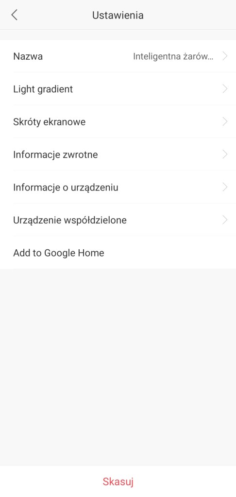 Aby uniknąć ponownego wyszukania urządzenia przez aplikację SmartThings, należy również usunąć żarówkę z aplikacji Yeelight. W tym celu otwieramy aplikację Yeelight, przechodzimy do głównego panelu starowania reflektora. Przechodzimy do ustawień (prawy górny róg). Na dole klikamy Skasuj a następnie potwierdzamy Ok.