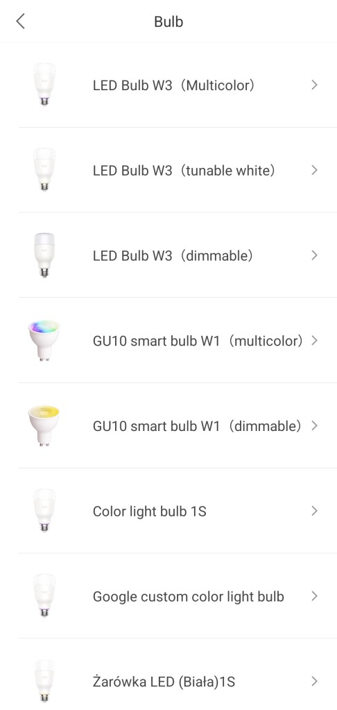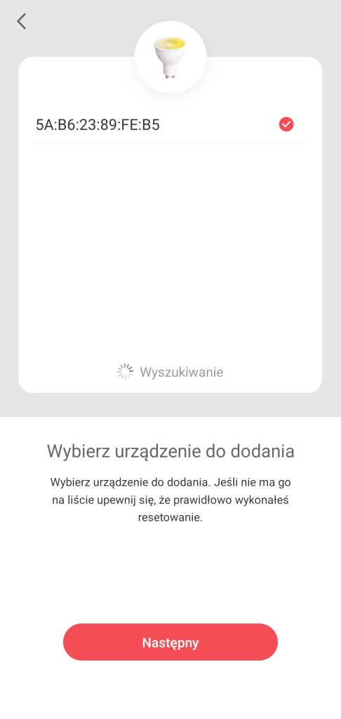 Po przejściu do ekranu głównego aplikacji Yeelight, klikamy Dodaj ( + ) w prawym górnym rogu ekranu, następnie Dodaj urządzenie. Możemy dodać już wyszukaną żarówkę lub z listy urządzeń wybrać. W tym celu wyszukujemy kategorię produktów Bulb, a następnie wybieramy GU10 smart bulb W1 (dimmable). Zostaniemy poproszeni o zresetowanie reflektora poprzez włączenie/wyłączenie światła 5 razy w ciągu 2 sekund. Po zresetowaniu aplikacja przystąpi do wyszukiwania żarówki, po jej znalezieniu, wybieramy ją zaznaczając „ptaszkiem” i klikamy Następny. Nastąpi teraz połączenie żarówki z naszym routerem Wi-Fi, klikamy Connect to another router. Zostaną wyszukane pobliskie sieci, wybieramy swoją, logujemy się, po potwierdzeniu połączenia. Nastąpi łączenie reflektora z routerem i siecią Wi-Fi, po sukcesie, możemy zmienić nazwę nowej żarówki, klikamy Następny. Wybieramy pokój dla urządzenia w aplikacji Yeelight, możemy pominąć ten krok, stukając Następny. Zgadzamy się bądź nie na sterowanie lokalne w aplikacji Yeelight, klikamy Wykonane. Ukaże się ekran główny sterowania reflektora Yeelight – tym samym żarówka została pomyślnie skonfigurowana w aplikacji. Polecam jeszcze sprawdzić czy dostępna jest aktualizacja oprogramowania, otwieramy lewe menu i klikając Aktualizacja oprogramowania.