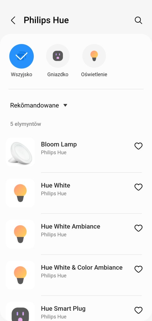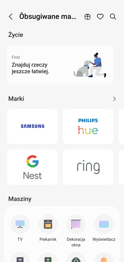Wybierając Obsługiwane urządzenia z menu (☰) aplikacji, możemy zobaczyć, które urządzenia współpracują z ekosystemem SmartThings. Cześć posiada informacje czy wymagany jest koncentrator SmartThings. W Polsce nie mamy możliwości zakupu, jak na zachodzie. Lista obecnie nie zgadza się z rzeczywiście obsługiwanymi urządzeniami oraz nie odzwierciedla sekcji dodawania urządzenia. Najprawdopodobniej jest to wstęp do wprowadzenia protokołu Matter, gdzie część urządzeń nie będzie wymagała centrali.