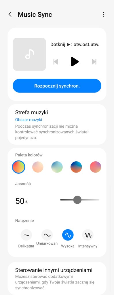 Usługa Music Sync posiada panel obsługi w sekcji Życie aplikacji SmartThings, możemy uruchamiać synchronizację świateł nie wchodząc bezpośrednio do usługi.