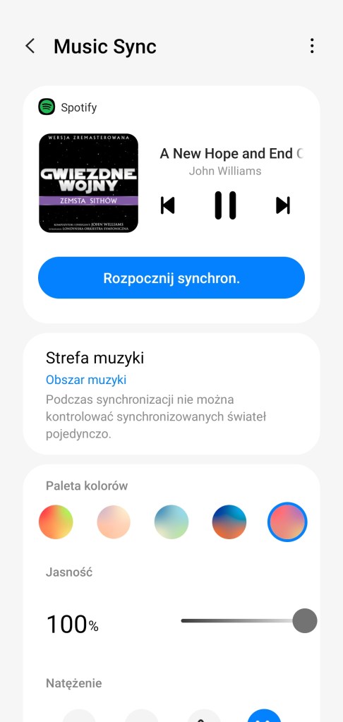 W głównym panelu usługi mamy możliwość sterowania obecnie odtwarzaną muzyką bez względu na wybraną usługę streamingową. Poniżej mamy wybraną strefę muzyki, która została wcześniej utworzona w aplikacji Hue, w każdej chwili możemy ją zmienić przenosząc grę świateł do innego pokoju. Ostatni panel to kontrola wizualizacji muzyki, mamy możliwość wybrania jednej z pięciu palet kolorów. Wybrane kolory będą się przenikać w czasie trwania utworu muzycznego. Następnie możemy wybrać jasność świateł w zakresie od 10 do 100% oraz jeden z czterech stopni natężenia: delikatny, umiarkowany, wysoki i intensywny. Poziom natężenia określa szybkość i ilość reakcji światła na rytm muzyki.