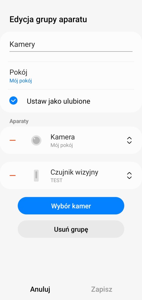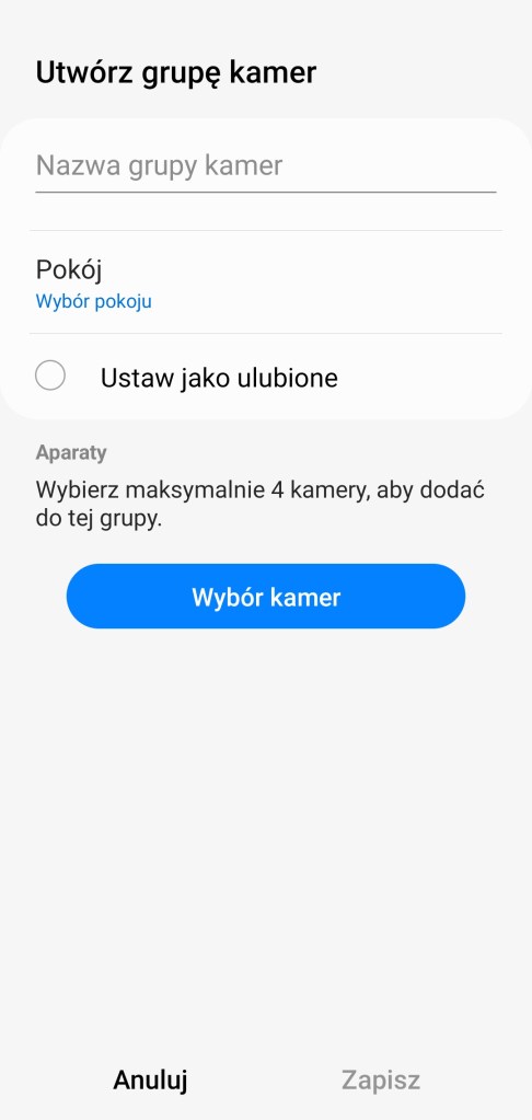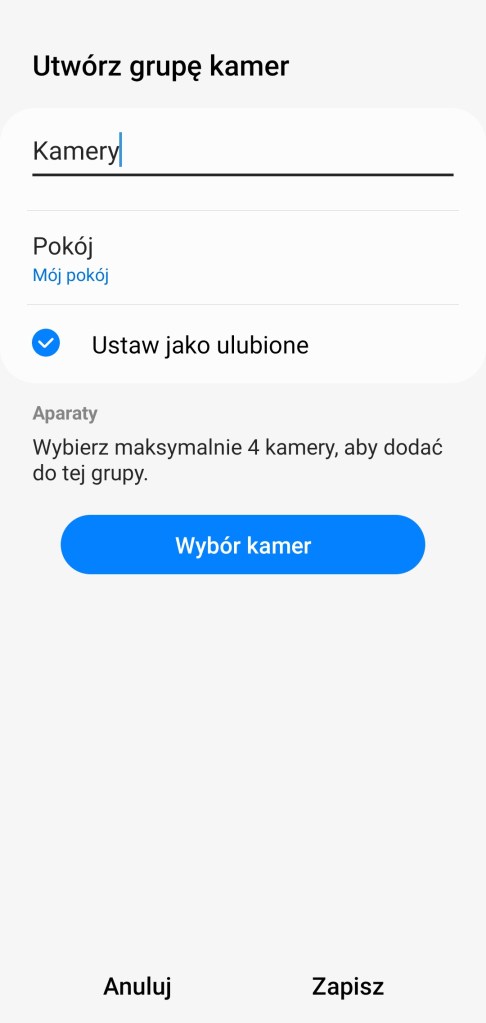 Aby stworzyć grupę kamer, w opcjach po prawej stronie wybieramy ikonę Dodaj ( + ). Następnie na liście powinna być dostępna opcja Utwórz grupę kamer, wybierz ją. W czasie konfiguracji mamy możliwość nadania nazwy grupie, wybrania pokoju, dodanie do listy „Ulubionych” oraz właśnie Wybór kamer. Po kliknięciu na nią mamy możliwość wybrania, które kamery chcemy mieć zgrupowane, zatwierdzamy stukając Gotowe. Zapisujemy wybraną konfigurację, klikając Zapisz na dole ekranu. Od tej chwili jest dostępny mniejszy kafelek z nazwą grupy. Po wejściu do grupy mamy możliwość podejrzenia aktualnego obrazu z kamer na żywo.