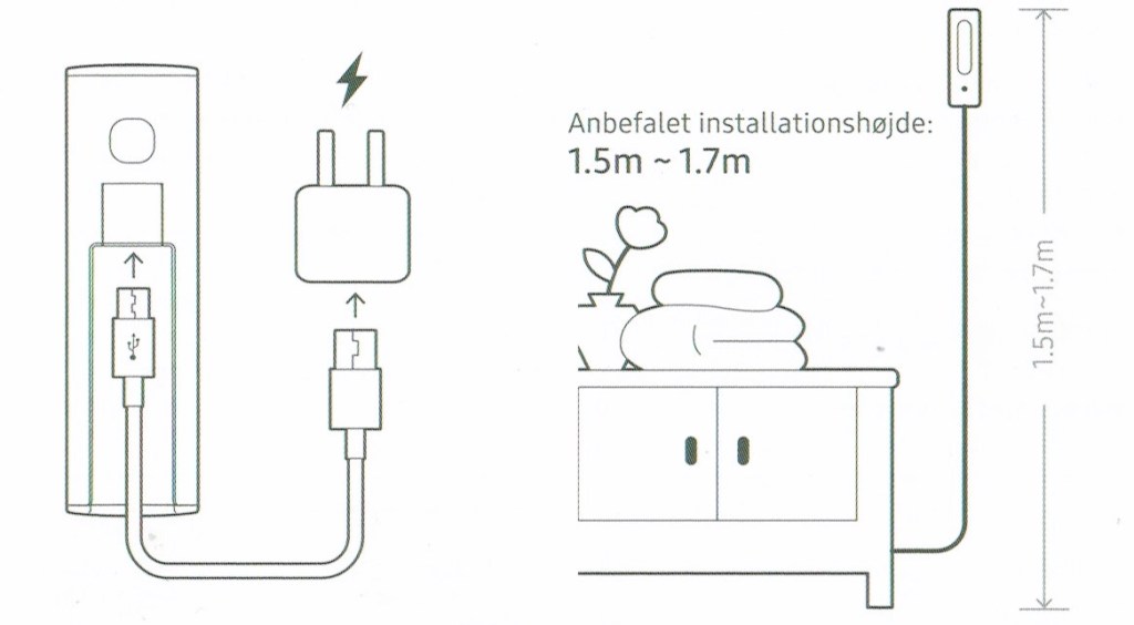 Sposób umieszczenia: Producent zaleca unikanie umieszczenia SmartThings Vision w środowiskach o wysokiej temperaturze, np. jak w pobliżu kaloryferów, pieców oraz umieszczania na urządzeniach generujących wibracje, takich jak lodówki lub klimatyzatory. Sensor możemy umieścić na płaskiej powierzchni, takiej jak biurko lub szafka lub zamontować na ścianie za pomocą pomocniczych akcesoriów montażowych dołączonych do pudełka. Zalecane jest umieszczenie go na wysokości 1,5 – 1,7 metrów od podłogi.