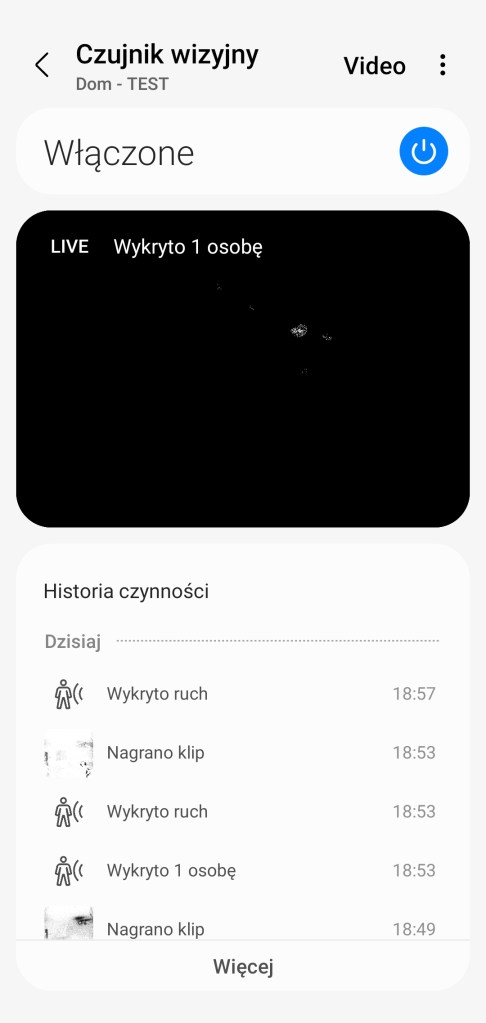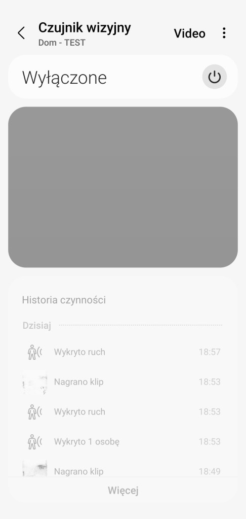 Na ekranie głównym aplikacji, SmartThings Vision charakteryzuje się duży panelem z ostatnim screenem z nagranego klipu wideo i ikoną wykrycia osoby, nie widzimy tutaj podglądu na żywo, jeśli sensor jest wyłączona, pojawia się ikona z przekreśloną kamerą.
