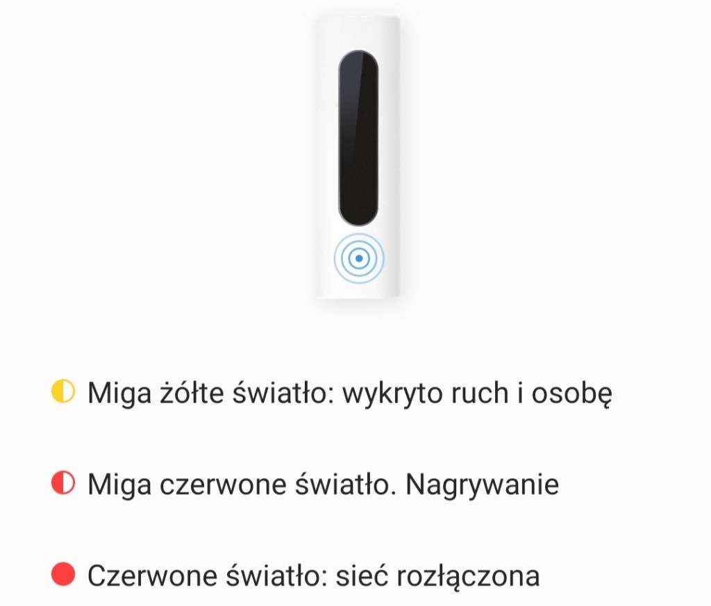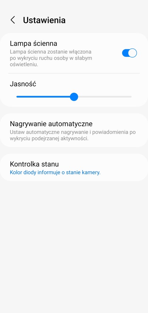 Poprzez kliknięcie Więcej opcji ( ⋮ ) w prawym górnym rogu ekranu, mamy dostęp do rozbudowanych ustawiań. Posiadamy ustawienie dotyczące lampy ściennej, możemy ją włączyć i wyłączyć oraz poziom jej jasności. Mamy możliwość zmiany ustawień automatycznego nagrywania, nagranie może nastąpić po wykryciu ruchu lub tylko osoby. Możemy uruchomić funkcje wykrywania upadku (wersja beta). Dodatkowo decydujemy o opcjach powiadomień push z nagranych klipów. Opcja Kontrola stanu pozwala sprawdzić co oznaczają komunikaty z diody LED. Sprawdzimy jakość sygnału sieci Wi-Fi, możemy uruchomić sensor ponownie – nastąpi jego wyłączenie i włączenie trwa to około jednej minuty. Na koniec możemy sprawdzić informacje np. o wersji oprogramowania czujnika ruchu.