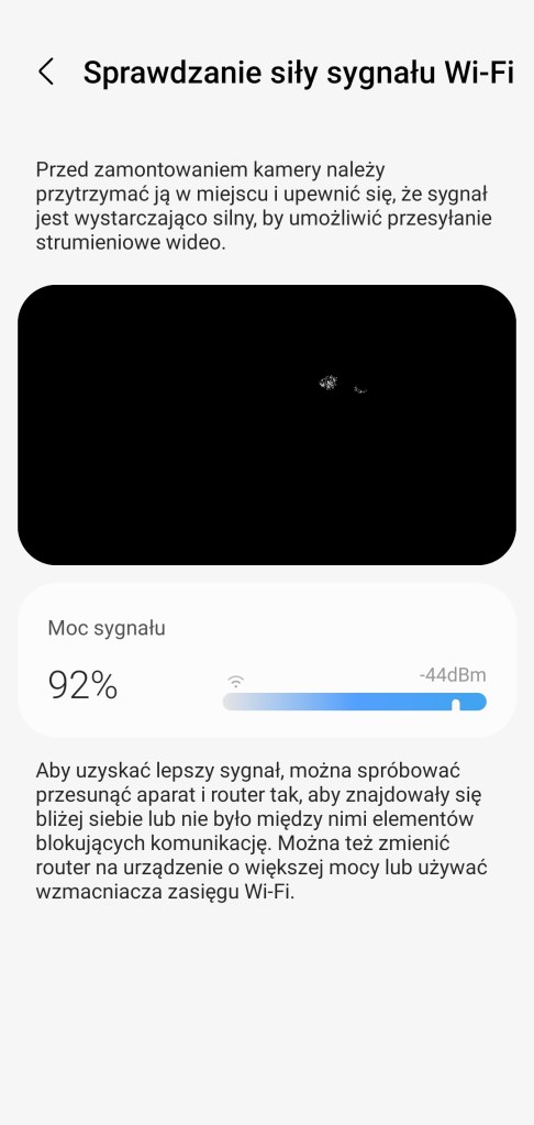 Posiadamy możliwość sprawdzenia siły sygnału między routerem WiFi a SmartThings Vision. Aby sprawdzić należy wybrać sensor Vision w aplikacji SmartThings i ją włączyć. Następnie wybierz Więcej opcji ( ⋮ ) w górnym prawym rogu ekranu i stuknij Sprawdzanie siły sygnału Wi-Fi. Należy pamiętać, aby unikać instalowania sensora w pobliżu urządzeń emitujących silne fale radiowe, ponieważ może to obniżyć wydajność Wi-Fi.