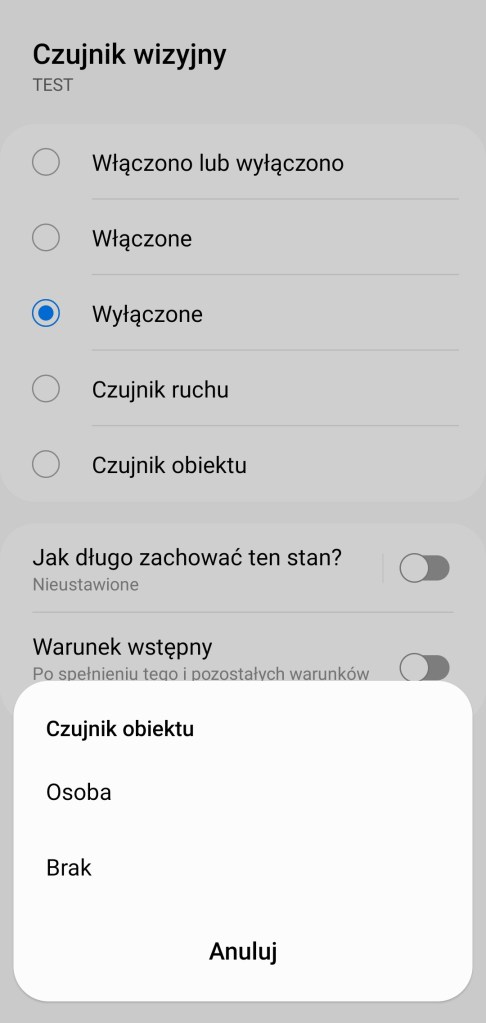 Tworzenie procedur (dawniej automatyzacje) „Jeśli … to Wtedy” musimy podzielić na dwa etapy, ponieważ znacznie się różnią. W pierwszej możliwości „Jeśli” urządzenie pozwala na wybranie opcji „Włączono lub wyłączono” czyli zmiana stanu, oraz „Włączone” i „Wyłączone”, dodatkowo opcję jak długo ten stan musi się utrzymać, zanim uaktywni się automatyzacja. Poniżej stan czujnika ruchu „Wykryto ruch” bądź „Bezruch” oraz stan czujnika obiektu „Osoba” lub „Brak”. W drugiej możliwości „Wtedy”, czujnik ruchu Vision pozwala na ciut więcej, ponownie mamy opcje „Włączono lub wyłączono” czyli zmiana stanu, oraz „Włączone” i „Wyłączone”. Żądanie uruchomienia nagrania „Nagraj”. Akcję uruchomienia możemy opóźnić o dowolny czas, jak i wyłączyć automatycznie po ustalonym czasie.