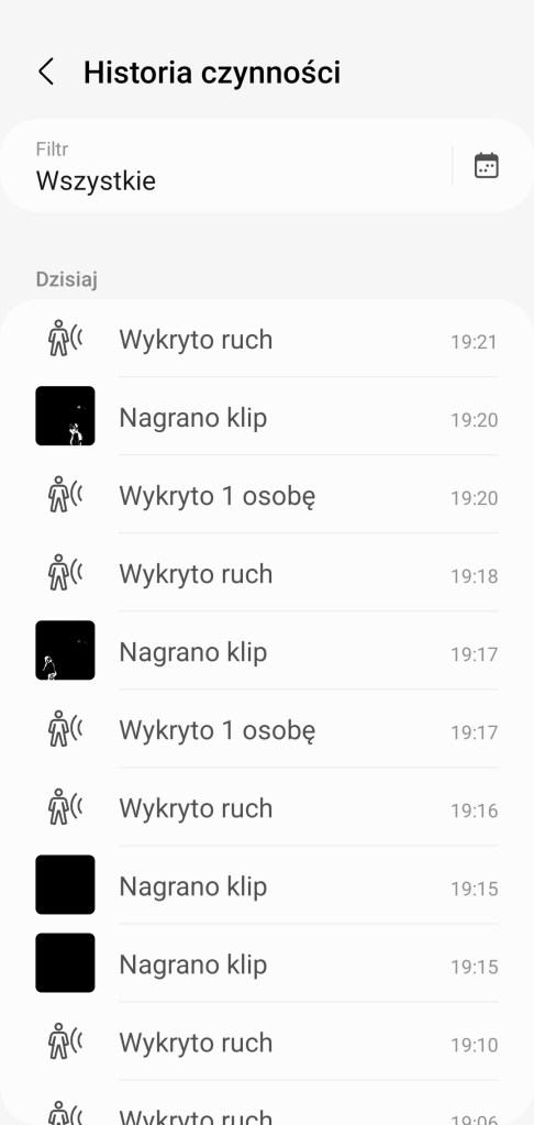 Panel „Historii” pozwala na dostęp do osi czasu oraz wybranie konkretnego dnia. Na osi czasu w postaci ikony możemy zauważyć wykryty ruch lub osobę oraz zarejestrowane nagrania. Po kliknięciu w nie, odtworzy się ono na pełnym ekranie.