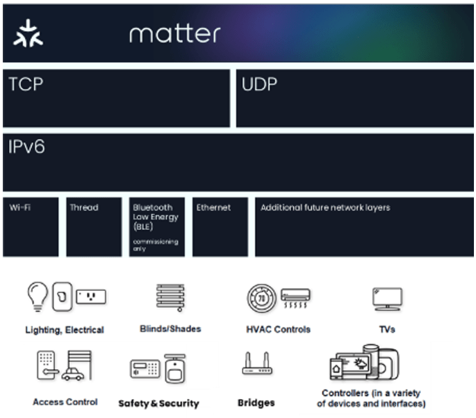 Matter (z perspektywy operacyjnej) przebiega w całości przez IPv6. Obecnie obsługiwane z punktu widzenia łączności są Wi-Fi, Thread i Ethernet. Materia dodatkowo definiuje warstwę wiadomości, która oddziela routing żądań i odpowiedzi.