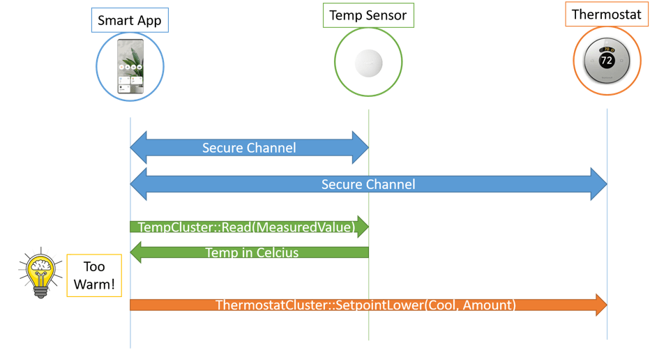 - Cała komunikacja z urządzeniem odbywa się przez bezpieczny kanał operacyjny. Cała komunikacja w Matter poza początkowym odkryciem jest zabezpieczona.