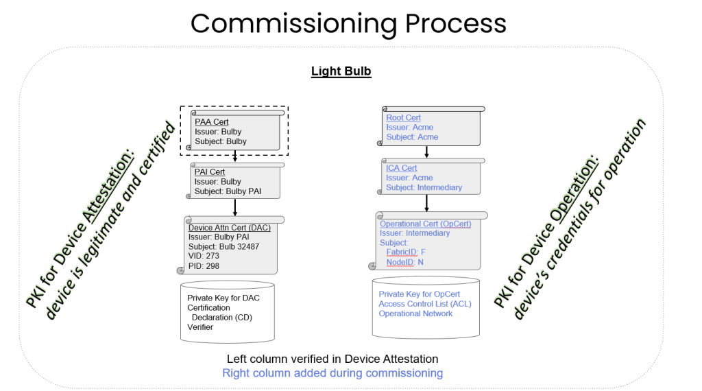 - Stwierdzenie, że urządzenie jest oryginalnym, certyfikowanym urządzeniem Matter (atest urządzenia) oraz mechanizm, za pomocą którego to urządzenie jest następnie dodawane do sieci domowej (rozruch), który może być zgodny z określonym przepływem lub spełniać niestandardowe wymagania dla samo urządzenie.