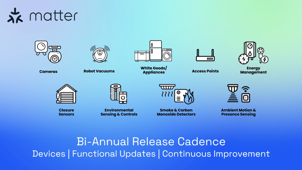 Według ujawnionego harmonogramu, planowane jest wydawanie kolejnych wersji Matter co pół roku, aktualizacje częstkowe (po kropce 1.1, 1.2 itd.) najbliższa aktualizacja przewidziana jest na marzec/kwiecień 2023 roku. Co dwa lata wydawana będzie duże rozwinięcie standardu, jako kolejny pełny numer (Matter 2.0, 3.0). Docelowo planowane jest rozwinięcie standardu o nowe typy urządzeń IoT, takie jak: kamery, roboty sprzątające, sprzęt AGD i RTV, punkty dostępu, urządzenia do zarządzenia energią, czujniki zamknięcia, czujniki środowiska (stacje pogody), czujniki dymu i CO oraz wykrywacze ruchu czy obecności.