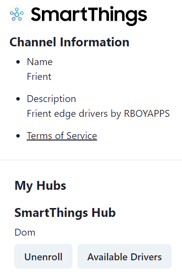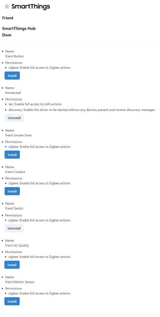 Przed dodaniem przełącznika do aplikacji SmartThings. Musimy uzyskać dostęp do sterowników SmartThings Edge, które pozwolą na prawidłowe wykrycie urządzenia oraz pozwolą sterować przełącznikiem lokalnie w centrali (bez dostępu do Internetu). Dodatkowo pozwalają skorzystać z dodatkowych funkcji, przewidzianych przez producenta. Pełną instrukcję dodania sterowników i ich listę znajdziesz w tym wpisie. W tym celu instalacji sterownika SmartThings Edge należy wejść na stronę (https://bestow-regional.api.smartthings.com/invite/oDM8g3pkrojL) oraz zalogować na konto, na którym został zbudowany Twój inteligentny dom. Zaakceptować warunki przystąpienia a następnie możemy wybrać nowe sterowniki do zainstalowania. Klikając w Available Drivers (Dostępne sterowniki), wybieramy pożądane przez nas sterowniki urządzeń, w tym wypadku „frient Switch”, instalujemy je poprzez kliknięcie Install. W każdej chwili możemy odinstalować, klikając Uninstall. Pamiętajmy, że na chwilę obecną możemy zainstalować sterowników Edge maksymalnie 50. Przy tworzeniu sterowników zaangażowany był RBOY APPS. W przyszłości ta procedura nie będzie konieczna, do prawidłowego wykrycia przełącznika Frient Smart Cable.