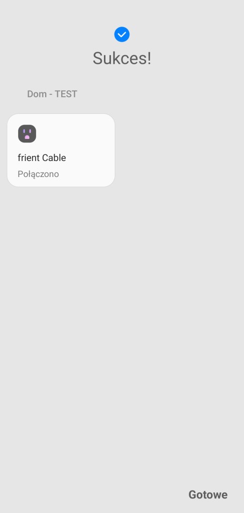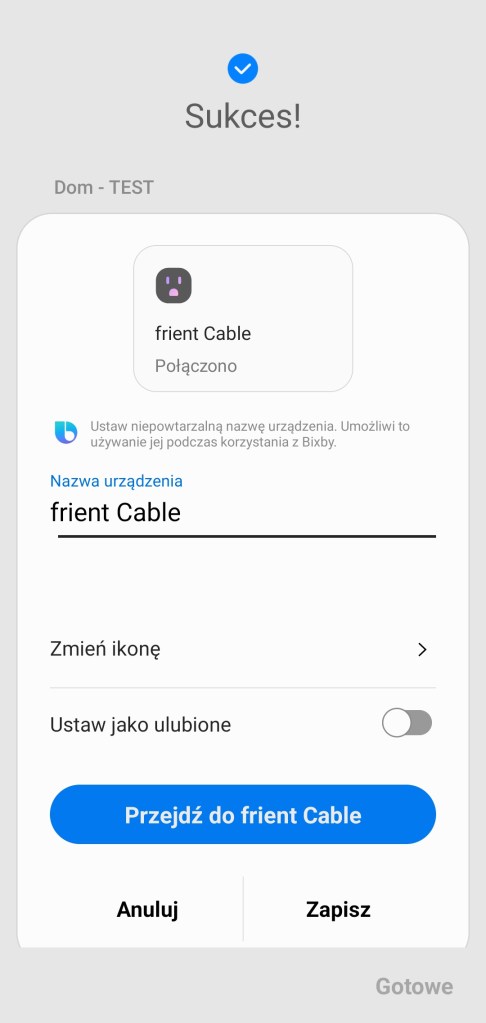 Jeśli posiadamy już zainstalowany sterownik SmartThings Edge, możemy przystąpić do dodania przełącznika Frient do ekosystemu SmartThings. Przechodzimy do aplikacji SmartThings, na ekranie głównym aplikacji, klikamy Dodaj ( + ) znajdujący się w prawym górnym rogu ekranu, kolejno Urządzenie, przesuwamy w dół do sekcji marek Wybór z listy urządzeń, znajdujemy markę frient, a później Gniazdko. Klikamy Rozpoczęcie, uruchamiając proces konfiguracji. Kontynuujemy pierwsze kroki, wybierając centralę i pomieszczenie dla nowego urządzenia. Po chwili zostanie znaleziony przełącznik i dodany do inteligentnego domu. Możemy zmienić nazwę urządzenia, jego ikonę lub dodać do panelu „Ulubione”, zatwierdzamy zmiany wybierając Zapisz. Kończymy proces instalacji, klikając Gotowe. Przełącznik pokaże się w wybranym pokoju.