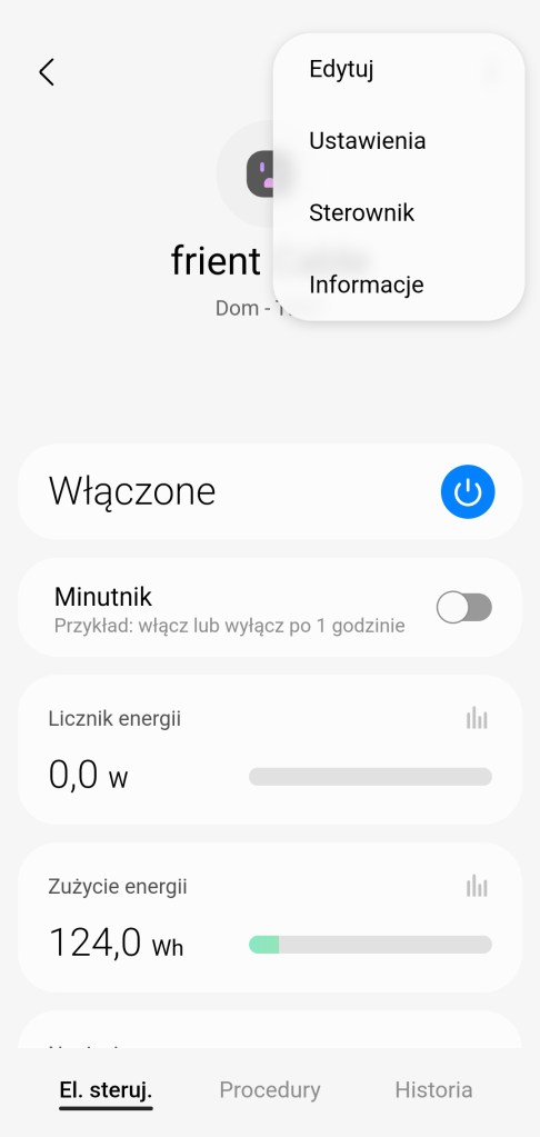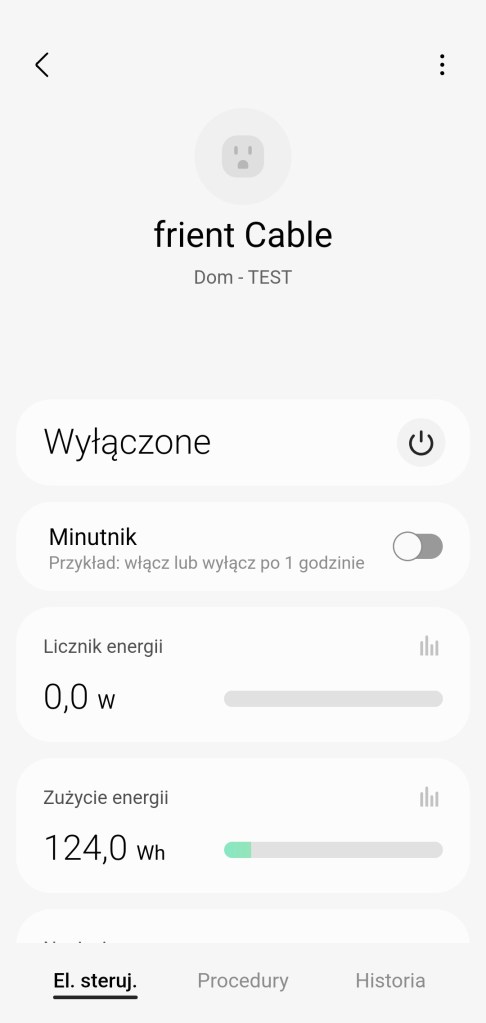 W głównym panelu sterowania urządzeniem Frient Cable Switch mamy na początku możliwość włączenia i wyłączenia przełącznika oraz możliwość uruchomienia szybkich automatyzacji np. minutnika. Poniżej znajdziemy informację o liczniku energii, zużycia energii, napięcia oraz „current”, czyli natężenie prądu elektrycznego. Następnie mamy panel z temperaturą, niestety jest to błąd – przypomnijmy przełącznik nie posiada czujnika temperatury. Ostatnią informacją jest źródło zasilania, gdzie zostaniemy poinformowani czy przełącznik zasilany jest prądem przemiennym, stałym, baterią czy nieznany. Panel „Historii” nie różni się znacznie od innych urządzeń, mamy dostęp do sortowania i przestudiowania historii działań urządzenia z ostatniego tygodnia. W ustawieniach „Edytuj” mamy standardową możliwość zmiany nazwy, ikony, lokalizacji, pokoju oraz możliwość dodania do panelu „Ulubione”. Co więcej posiadamy dodatkowe „Ustawienia” w Więcej opcji ( ⋮ ) w prawym górnym rogu ekranu, dotyczą one kalibracji czujnika temperatury jest to oczywiście błąd.