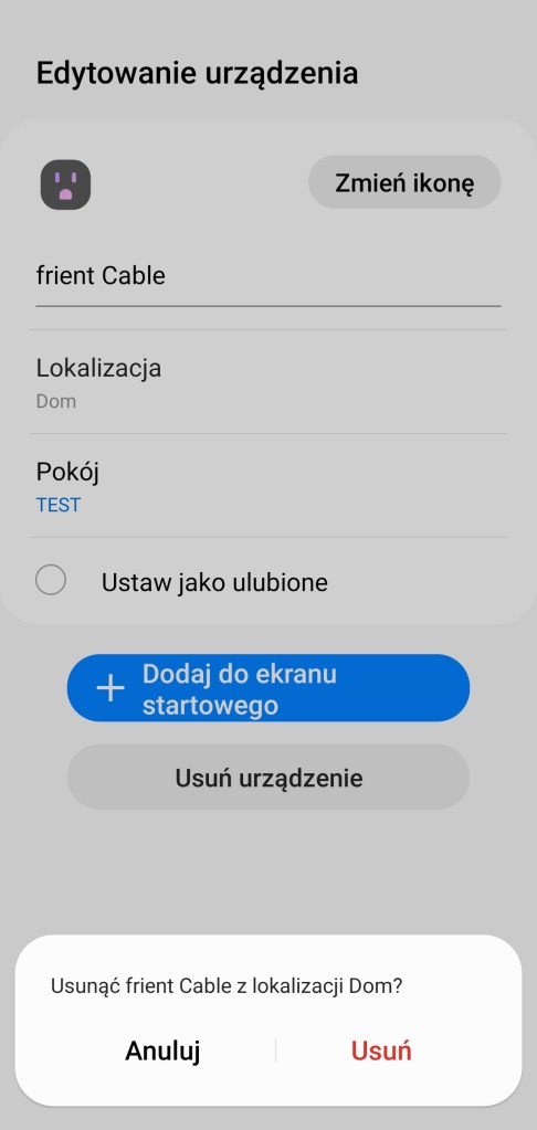 Aby skutecznie usunąć przełącznik Frient z ekosystemu SmartThings, należy wejść w główny panel urządzenia. Kliknąć Więcej opcji ( ⋮ ) w prawym górnym rogu ekranu, a następnie Edytuj. W panelu edycji, wybieramy Usuń urządzenie. Następnie potwierdzamy operację, stukając Usuń. Teraz należy przystąpić do resetu przełącznika.