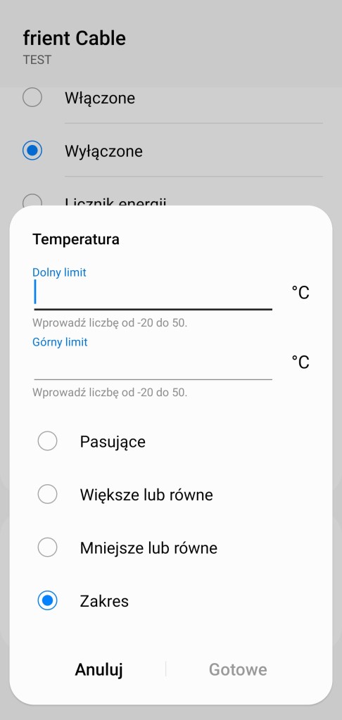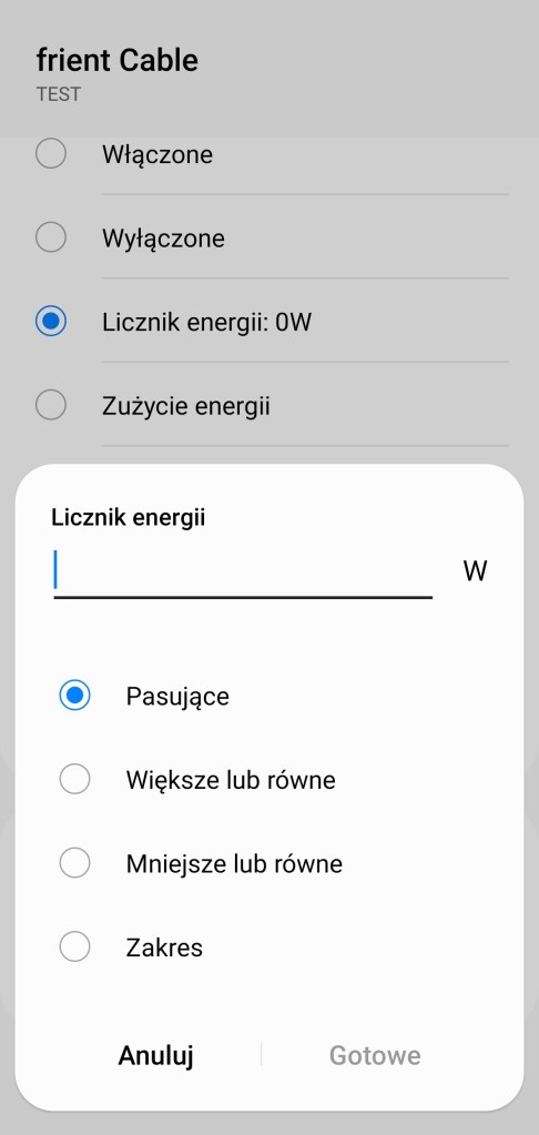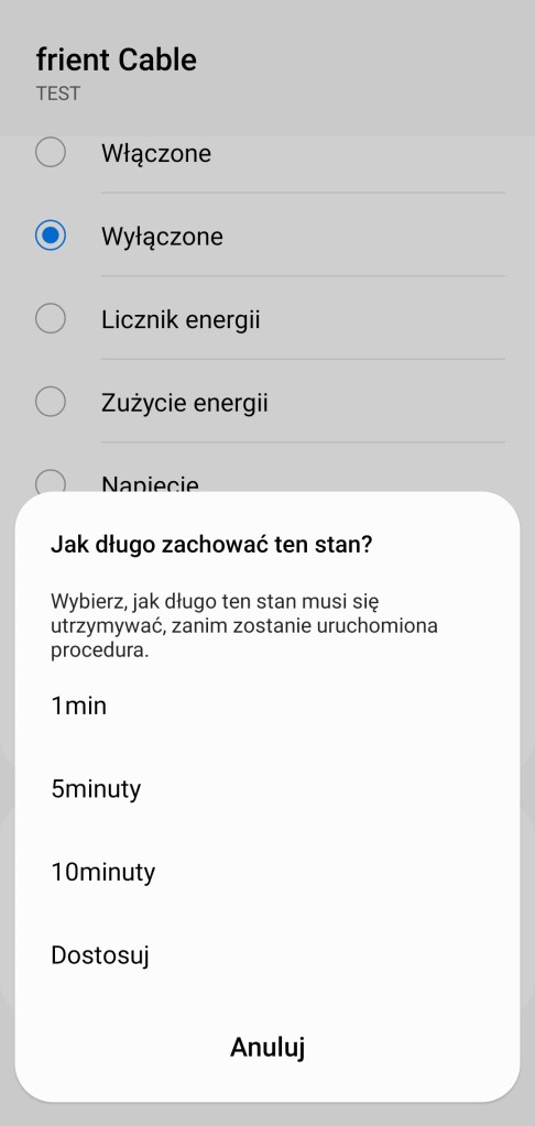 Tworzenie procedur (dawniej automatyzacje) „Jeśli … to Wtedy” musimy podzielić na dwa etapy, ponieważ znacznie różnią się dostępne opcje jeśli inicjujemy warunek „Jeśli”. W pierwszej możliwości „Jeśli” urządzenie pozwala na wybranie opcji „Włączono lub wyłączono” czyli zmiana stanu, oraz „Włączone” i „Wyłączone”. Następnie „Licznik energii”, „Zużycie energii”, „Napięcie”, „Current”, czyli natężenie prądu – we wszystkich tych wskazaniach możemy np. otrzymać powiadomienie, kiedy tylko ustalona przez nas wartość pasuje, jest większa/mniejsza niż odczytana oraz zakres podanych wartości. Kolejna opcja dotyczy temperatury, jest to błąd urządzenie nie posiada czujnika temperatury. Ostatnia opcja dotyczy „Źródła zasilania”, zależnie od zidentyfikowanego zasilania możemy zainicjować dalsze działania warunku „wtedy”. Posiadamy również możliwość ustawienia jak długo dany stan ma trwać, zanim uruchomiona zostanie procedura.