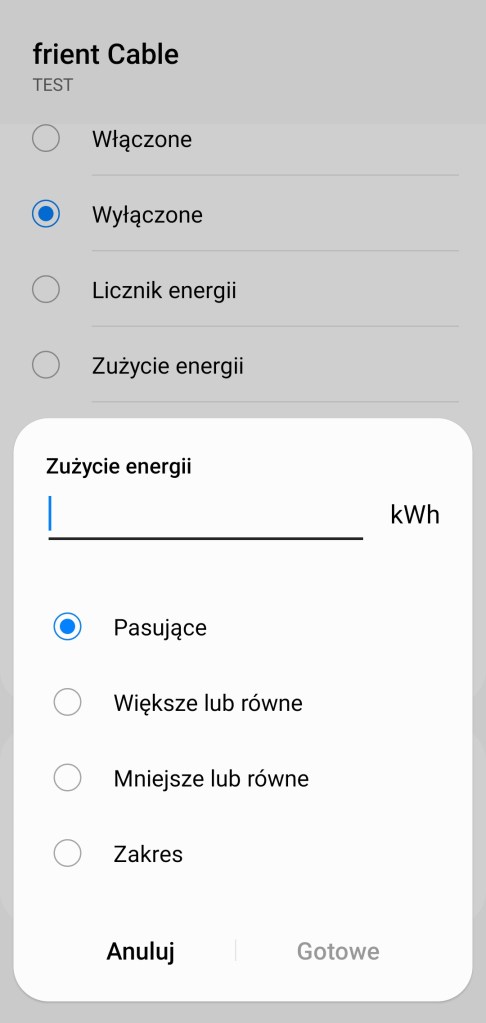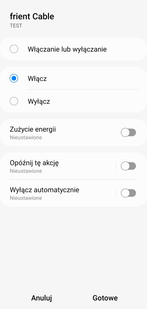 W drugiej możliwości „Wtedy”, mamy możliwość skorzystania już tylko z możliwości przełącznika, czyli podłączenia/odcięcia zasilania. Na początku mamy możliwość wybrania opcji „Włączanie lub wyłączanie” czyli zmiana stanu, oraz „Włącz” i „Wyłącz”. Daną akcję przełączenia możemy opóźnić o dowolny czas, jak i wyłączyć automatycznie po ustalonym czasie. Dodatkowo posiadamy opcję „Zużycie energii”, włączenie tej opcji spowoduje zresetowanie liczników zużycia energii elektrycznej.