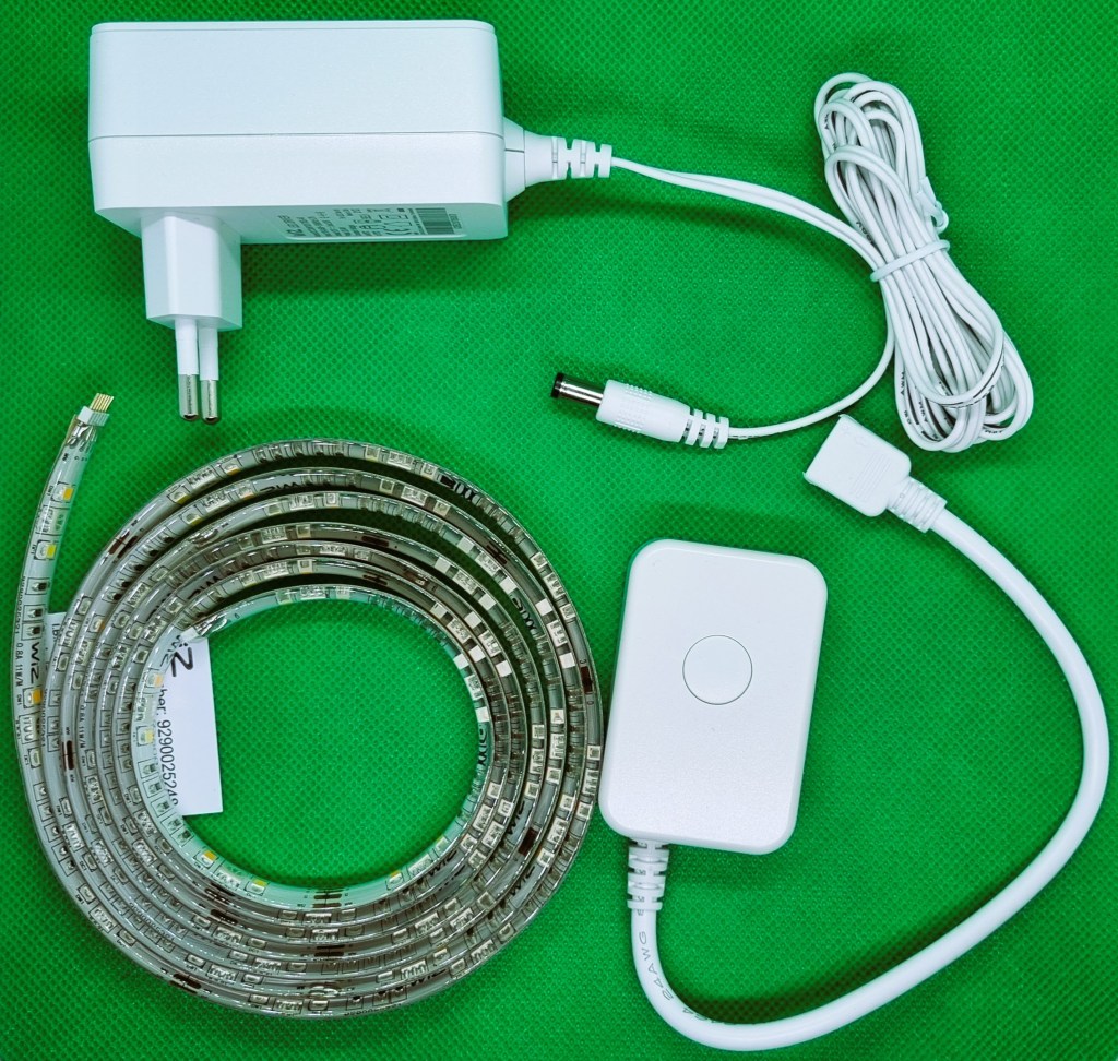 Listwa świetlna WiZ Colors LED Strip 2M starter kit (model Wi-Fi BLE LEDstrip 2M 1600lm starterkit EU) to taśma LED o długości 2 metrów z dołączonym odpinanym zasilaczem, ze zmiennym kolorem w palecie barw RGB co oznacza aż 16 milionów kolorów i 64 tysiące odcieni bieli w zakresie 2700-6500 K, posiada dodatkowo opcję ściemniania w zakresie 1 – 100%. Maksymalnie dostaniemy 1600 lm jasności przy 4000 K, dla 2700 K będzie to 800 lm. Listwa ma moc sięgającą do 20W, napięcie zaś 220-240V 50-60 Hz. Producent zapewnia o żywotności 15 tysięcy godzin i aż 50 tysięcy przełączeń zasilania, co pozwala na użytkownie przez ponad 11 lat (przy 3 godzinach pracy dziennie). Komunikacja odbywa się po protokole Wi-Fi (802.11 b/g/n 2,4 GHz) bądź Bluetooth, i za pośrednictwem serwera, co troszkę opóźnia reakcję na komendę. Dużym plusem jest, że taśma WiZ nie wymaga żadnego dodatkowego huba. Listwa świetlna posiada 2 metry LEDów z możliwością przedłużenia do 10 metrów. Wymiary to 0,22 cm wysokości i szerokości 1,2 cm oraz 240 gramów wagi. Dostosowana do pracy w pomieszczeniach IP20. Kabel zasilacza ma długość 1,5 metra, a kabel od przełącznika do listwy świetlnej tylko 20 cm. Włącznik pozwala nam włączyć i wyłączyć listwę poprzez naciśnięcie przycisku, za pomocą przytrzymania możemy zmienić jej jasność.