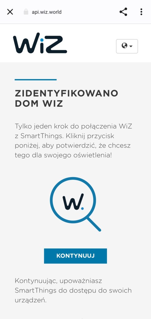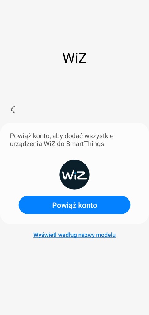 Po dodaniu urządzeń w aplikacji WiZ, możemy przystąpić do połączenia usług WiZ i SmartThings. Przechodzimy do aplikacji SmartThings, aby dodać urządzenie do inteligentnego domu. Klikamy na ekranie głównym przycisk Dodaj ( + ), w prawym górnym rogu ekranu. Następnie Dodaj urządzenie, przesuwamy w dół do sekcji marek Wybór z listy urządzeń, wybieramy markę WiZ i wybierz Powiąż konto. Kontynuujemy pierwsze kroki, wybierając lokalizację i pokój dla urządzenia. Zostaniemy przeniesieni na stronę internetową WiZ, gdzie wpisujemy wcześniej skopiowany kod aktywacyjny, klikamy strzałkę. Zostaniemy poinformowani o zidentyfikowaniu i potwierdzamy połączenie z ekosystemem SmartThings, klikając Kontynuuj. Zostaniemy poinformowani o udanym połączeniu usług WiZ i SmartThings. Zamykamy iksem w lewym górnym rogu stronę internetową i po chwili pokaże nam się lista wszystkich urządzeń z aplikacji WiZ. Klikamy Gotowe, znalezione urządzenia pojawią się w wybranym wcześniej pokoju, jeśli tak się nie stanie szukaj ich w sekcji nieprzypisanych do żadnego z pokoi.