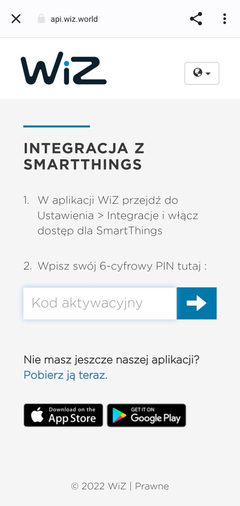Jeśli posiadamy już zainstalowane wszystkie listwy, żarówki oraz wtyczki. Możemy przejść do uzyskania kodu aktywacji, który posłuży do połączenia usług WiZ i SmartThings. W tym celu należy przejść do ustawień aplikacji WiZ, na dole ekranu klikamy sekcję Ustawienia. Z dostępnych opcji wybieramy Integracje, a następnie kliknij SmartThings i włącz ją za pomocą przycisku przełączania, pojawi się wtedy kod. Jest ważny przez 5 minut i jest kluczem do połączenia Twojego domu WiZ z ekosystemem SmartThings. Skopiuj ten kod do schowka, a następnie przejdź do aplikacji SmartThings.