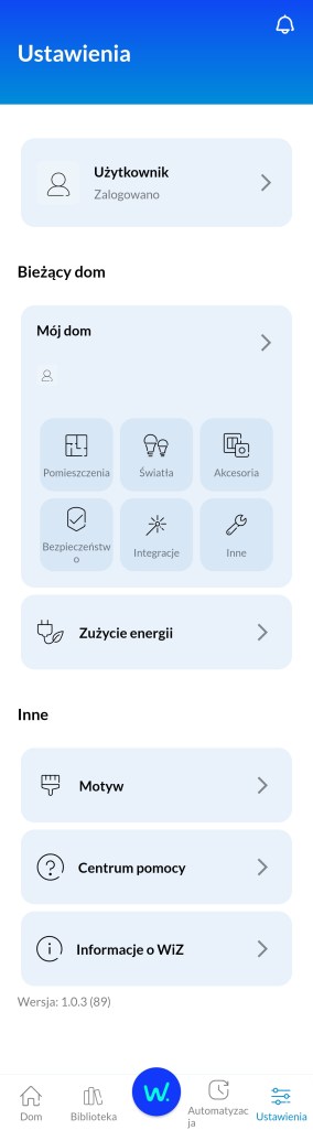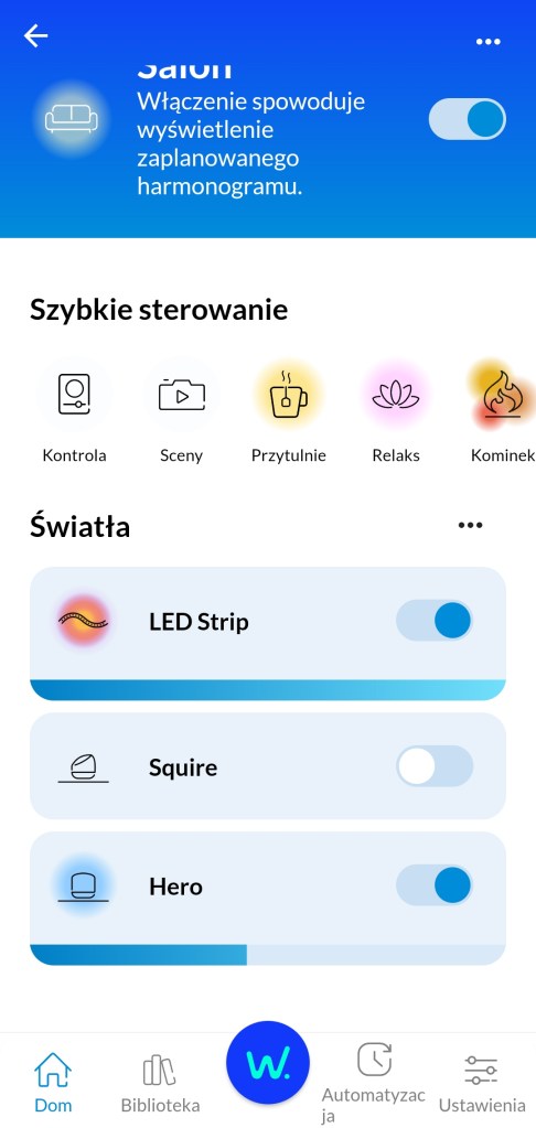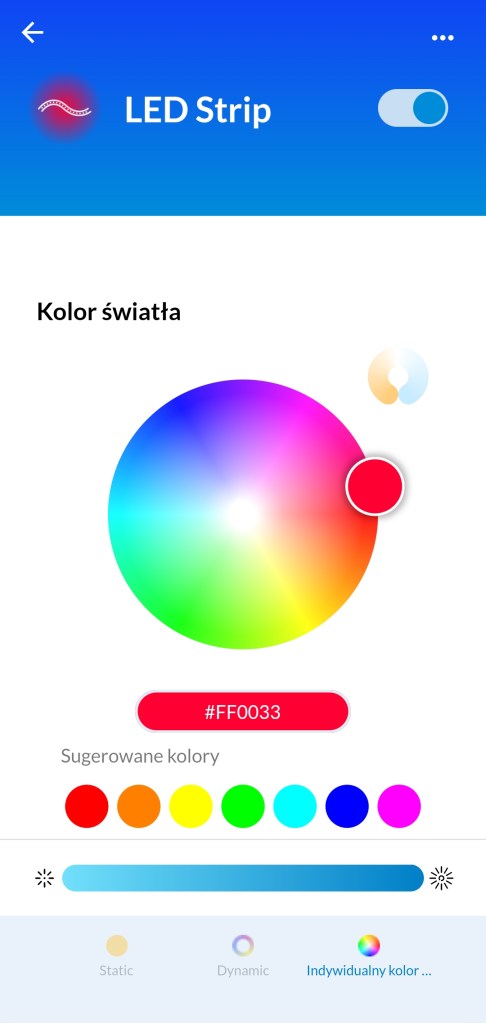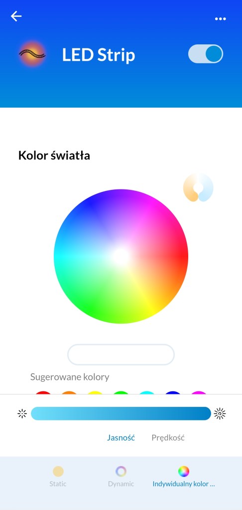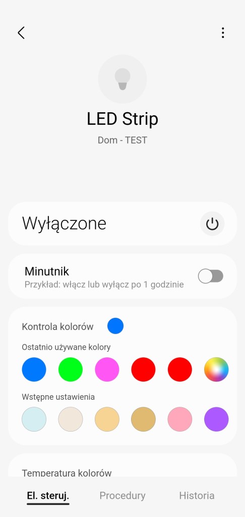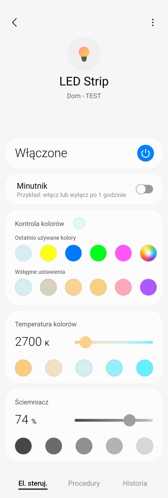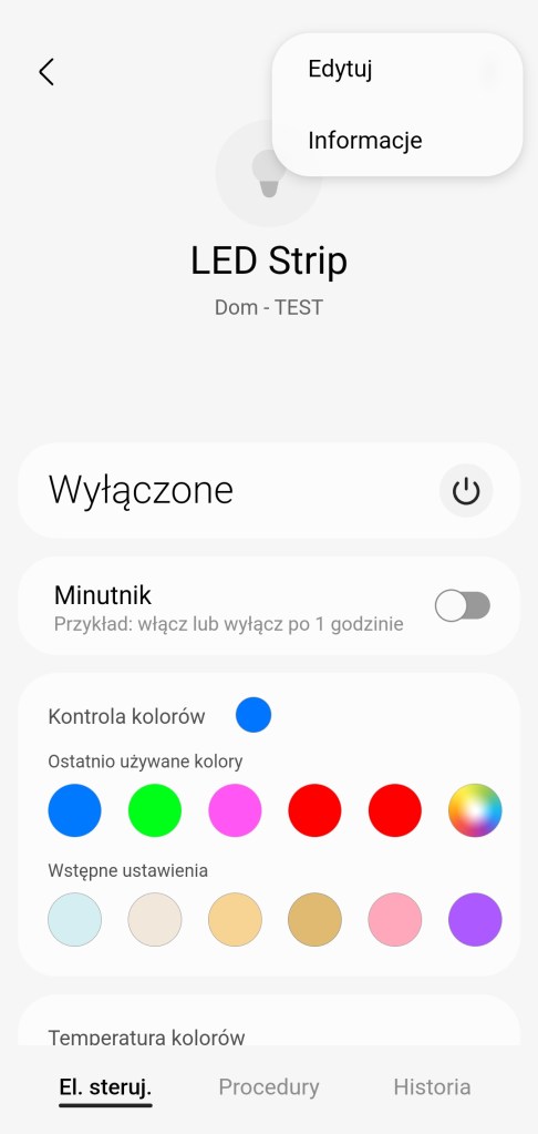W głównym panelu aplikacji mamy możliwość włączenia/wyłączenia listwy świetlnej WiZ, możliwość ustawienia minutnika. Poniżej posiadamy możliwość ustawienia dowolnego koloru z palety barw RGB, jak i pięć ostatnio używanych kolorów oraz sześć sugestii. Kolejna belka umożliwia ustawienie temperatury światła w zakresie 2200 K – 9000 K, zakres jest błędny ponieważ w specyfikacji mamy możliwość 2700 K – 6500 K temperatury światła. Ostatnia opcja pozwala na ustawienie ściemniacza od 1 do 100%. Pod ściemniaczem posiadamy również pięć kół, będących przyciskami ustawiającymi ściemniacz na kolejno od lewej 10%, 30%, 50%, 70% oraz 90% jasności. Na dole znajdziemy sekcję panel „Procedury” znajdziemy tutaj szybkie procedury: włączenia i wyłączenia urządzenia o danej porze dnia oraz listę procedur gdzie używane jest urządzenie. Panel „Historii” nie różni się znacznie od innych urządzeń, mamy dostęp do sortowania i przestudiowania historii działań listwy. W ustawieniach „Edytuj” mamy standardową możliwość zmiany nazwy, lokalizacji, pomieszczenia oraz możliwość dodania do panelu „Ulubione”.