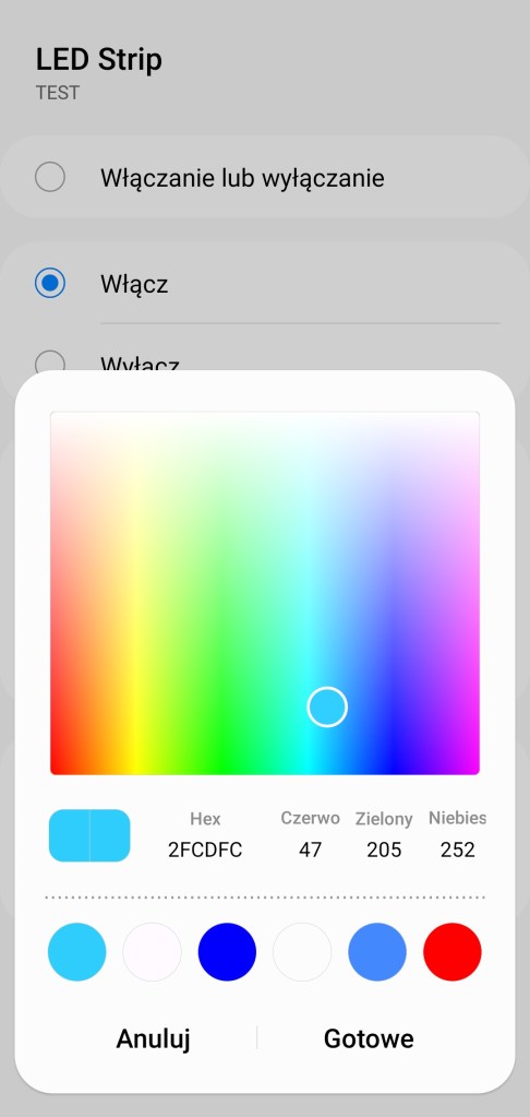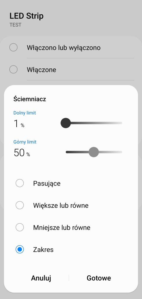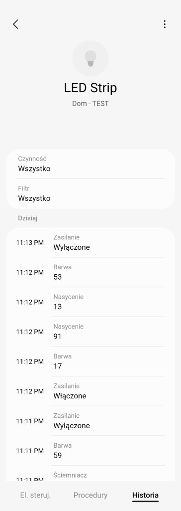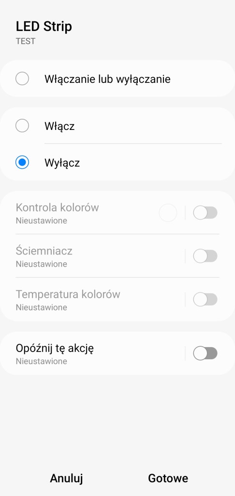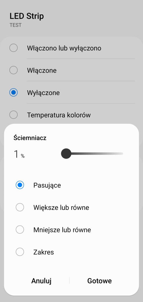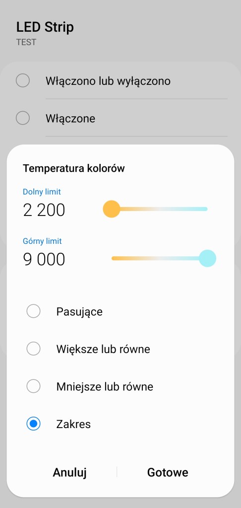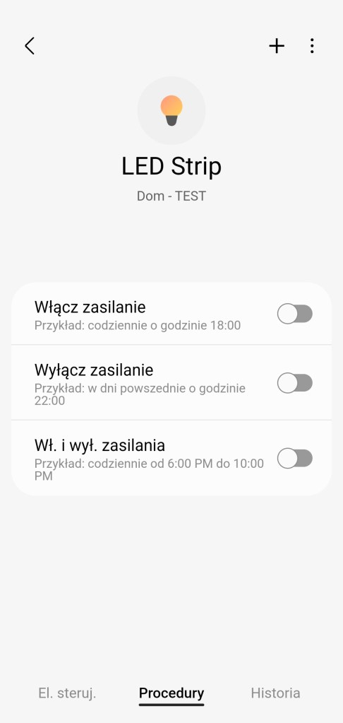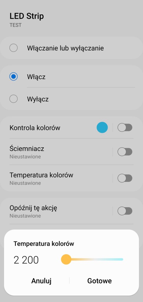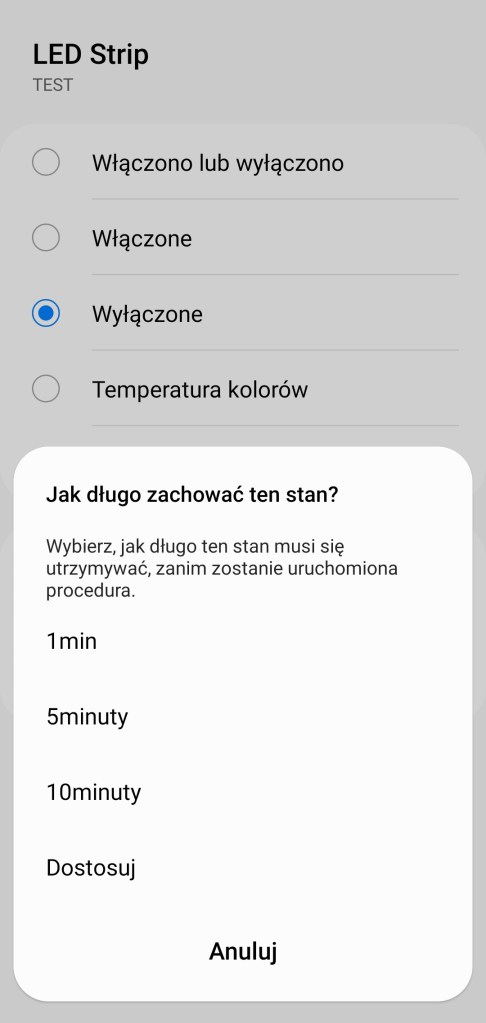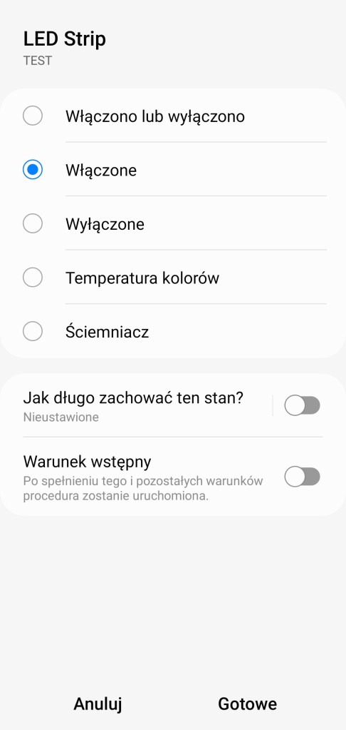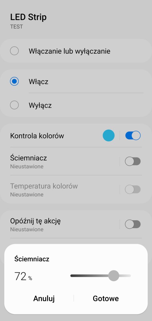 Tworzenie procedur (dawniej automatyzacje) „Jeśli … to Wtedy” musimy podzielić na dwa etapy, ponieważ znacznie różnią się dostępne opcje, jeśli inicjujemy warunek „Jeśli”. W pierwszej możliwości „Jeśli” urządzenie pozwala na wybranie opcji „Włączono lub wyłączono” czyli zmiana stanu, oraz „Włączone” i „Wyłączone”. Poniżej mamy wartość ściemniacza i temperatury kolorów z zakresu 2200 – 9000 K. Zakres temperatury kolorów jest błędy, taśma LED pozwala uzyskać 2700 K – 6500 K. Możemy ustawić również zakres tych wartości. Dodatkowo posiadamy opcję jak długo zachowany powinien być stan przed uruchomieniem automatyzacji oraz czy ma być to warunek wstępny. W drugiej możliwości „Wtedy”, świeczka pozwala na dużo więcej, mamy pełną możliwość tworzenia opcji przydatnych w programowaniu już np. scenerii. Mamy ponownie opcje „Włączono lub wyłączono” czyli zmiana stanu, oraz „Włączone” i „Wyłączone”. Ustawienie jednego z kolorów, jasności listwy z zakresu 0 – 100%, bądź temperatury barwy z zakresu 2200 – 9000 K. Tutaj również pojawia się ze zbyt dużym zakresem temperatury świetlnej. Akcję uruchomienia listwy możemy opóźnić o dowolny czas, jak i wyłączyć ją automatycznie po ustalonym czasie.