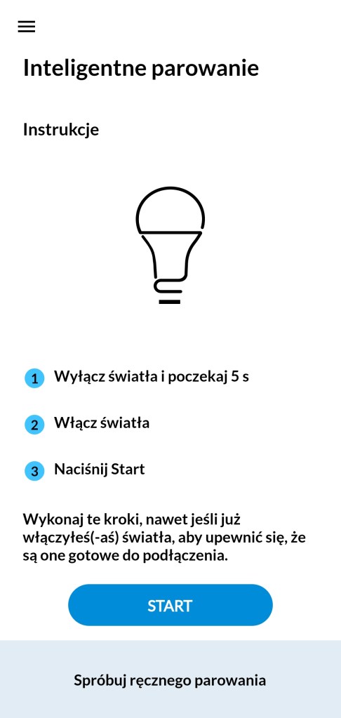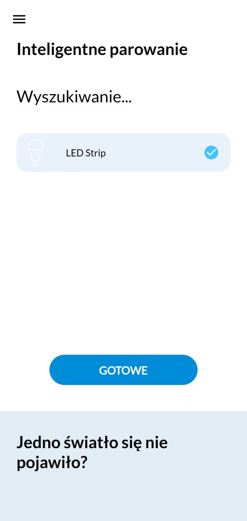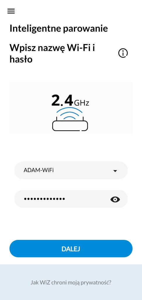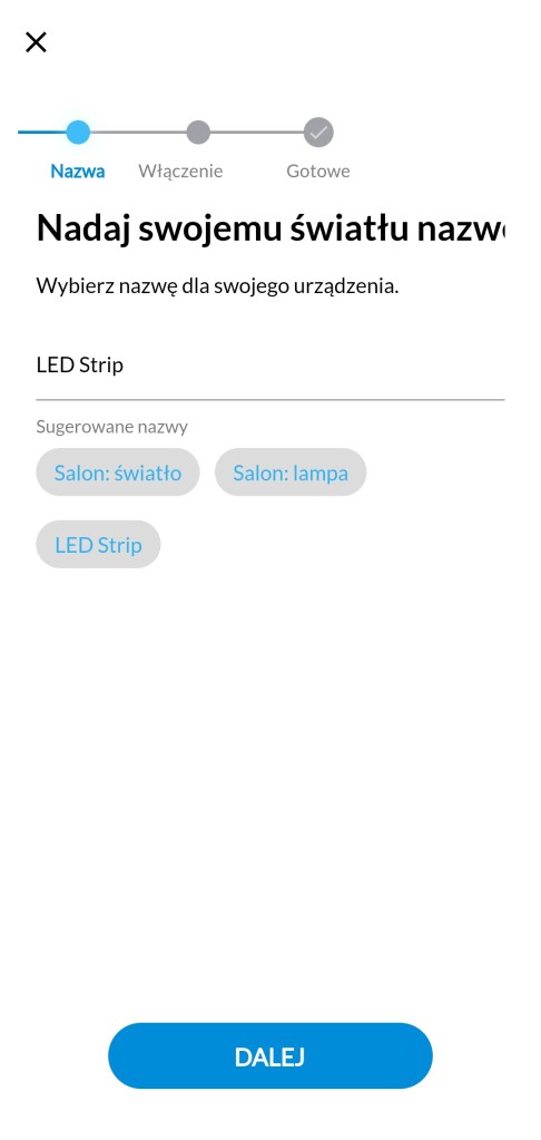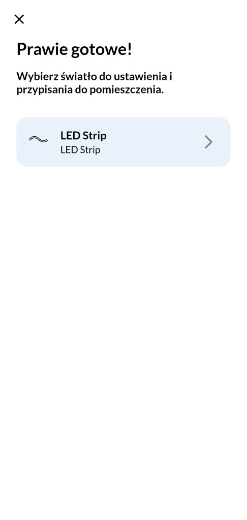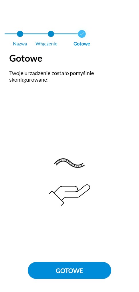 Na początku musimy złożyć listwę świetlną, łączymy zasilacz z sterownikiem taśmy, a następie podpinamy listwę świetlną za pomocą złącza z 6 pinami. W wyznaczonych miejscach na taśmie świetlnej możemy skrócić długość listwy oświetleniowej. Podłączamy zasilacz taśmy do gniazdka elektrycznego. Zanim przejdziemy do instalowania listwy musimy pobrać aplikację WiZ z Google Store bądź AppStore. Po zainstalowaniu aplikacji możemy przejść do dodania jej do aplikacji WiZ. Pełną konfigurację z tworzeniem pokoi przedstawiamy tutaj. Jeśli posiadamy już utworzony pokój, możemy przejść do dodania lampy, w prawym górnym rogu ekranu klikamy Dodaj urządzenie ( + ). Wybieramy do którego pokoju dodajemy urządzenie. Klikamy odpowiedni typ urządzenia, w tym przypadku Taśma LED. Teraz rozpoczynamy parowanie urządzenia (informacja o długości fali Wi-Fi, dostępna jest tylko 2,4 GHz), wpisujemy dane do naszego routera Wi-Fi. Zależenie czy nasze urządzenie jest całkowicie nowe czy było już używane wybieramy odpowiednią opcje, w naszym wypadku to Tak, zupełnie nowe. Wykonaj instrukcje na ekranie inicjującą parowanie lampy, kliknij Start. Po chwili zostanie znaleziona listwa LED, klikamy jej nazwę. Następnie przechodzimy przez proces początkowej konfiguracji, nadajemy nazwę, wybieramy opcje dotyczące przełączania zasilania (do wyboru WiZclick lub Ostatni status), kończymy proces wybierając Gotowe, od teraz możemy sterować taśmą LED z poziomu aplikacji WiZ.