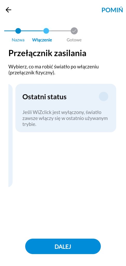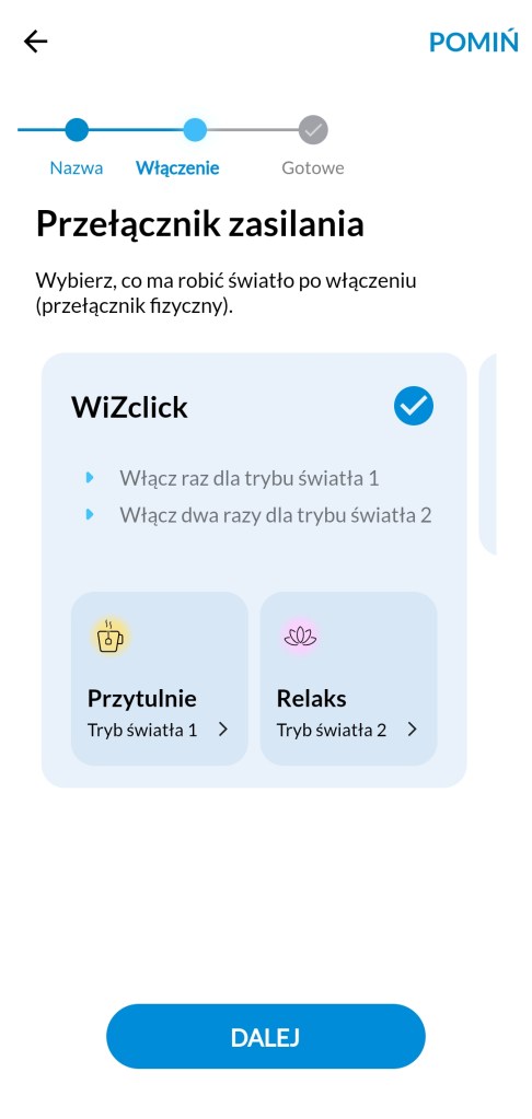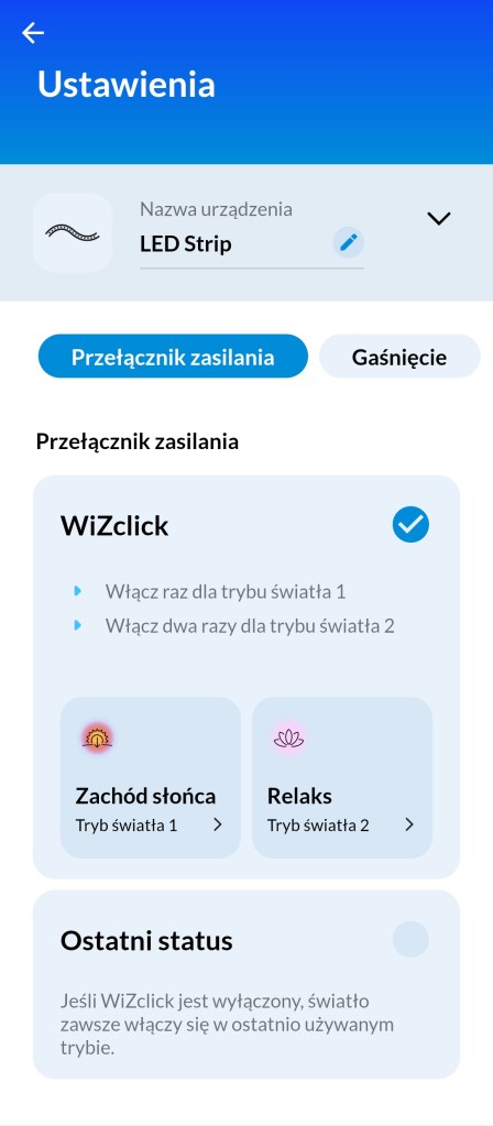 W ustawieniach listwy WiZ, w aplikacji producenta, znajdziemy ciekawą opcję o nazwie „WiZclick”. Dzięki niej posiadamy możliwość ustawienia co się stanie po przywróceniu zasilania w gniazdku zasilającym. Posiadamy dwie opcje dla pierwszego włączenia zasilania oraz dla dwukrotnego szybkiego przełączenia włącznika ściennego. Dla każdej z opcji możemy ustawić swój ulubiony kolor. Dodatkowo możemy zrezygnować z tej opcji i listwa po prostu zapamięta ostatni używany kolor.