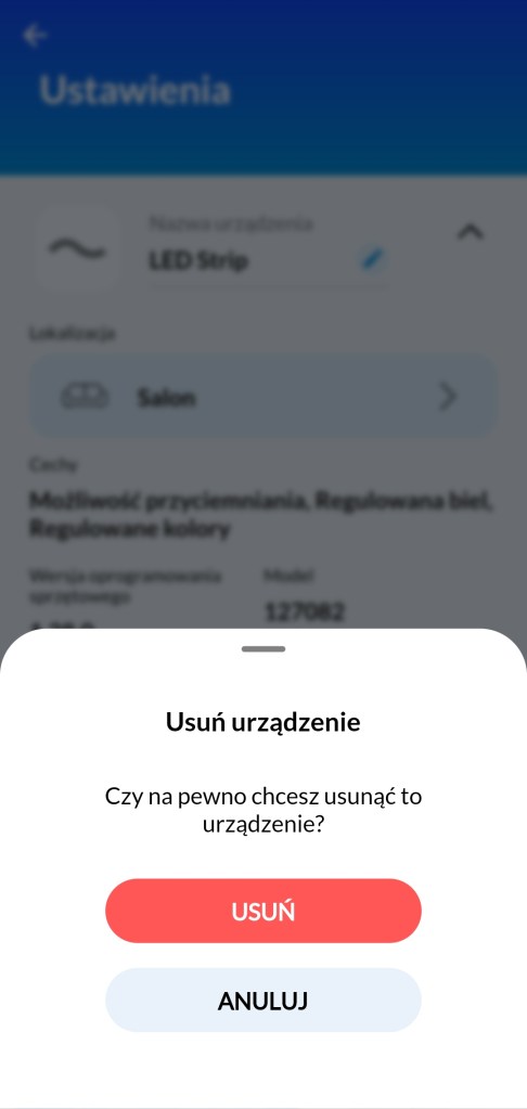 Aby uniknąć ponownego wyszukania urządzenia przez aplikację SmartThings, należy również usunąć listwę świetlną z aplikacji WiZ. W tym celu otwieramy aplikację WiZ, przechodzimy do pomieszczenia, a następnie do głównego panelu sterowania listwy. W prawym górnym rogu ekranu, znajdziemy Więcej ustawień ( … ), następnie klikamy Ustawienia. Możemy teraz ustawić reakcję urządzenia na przełączanie zasilania oraz szybkość gaśnięcia oświetlenia. Aby usunąć listwę, należy wybrać strzałkę ( ˅ ) przy nazwie, wyświetlą się szczegóły urządzenia, na dole klikamy Usuń a następnie potwierdzamy Usuń.