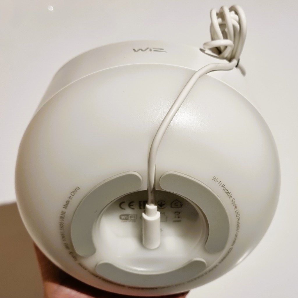 Lampa WiZ Squire (model WiZ Squire Portable 9W 22-65K RGB) ze zmiennym kolorem w palecie barw RGB co oznacza aż 16 milionów kolorów i paletę odcieni bieli w zakresie 2200-6500 K, posiada dodatkowo opcję ściemniania w zakresie 1 – 100%. Lampa oddzielnie emituje światło dla górnej i dolnej części oświetlenia. Maksymalnie dostaniemy 620 lm jasności przy 4000 K, dla 2700 K będzie to 300 lm. Wskaźnik oddawania barw (CRI) sięga 80. Lampa ma moc sięgającą do 9W, napięcie zaś 220-240V 50-60 Hz. Producent zapewnia o żywotności 25 tysięcy godzin i aż 20 tysięcy przełączeń zasilania, co pozwala na użytkownie przez ponad 24 lata (przy 3 godzinach pracy dziennie). Komunikacja odbywa się po protokole Wi-Fi (802.11 b/g/n 2,4 GHz) bądź Bluetooth, i za pośrednictwem serwera, co troszkę opóźnia reakcję na komendę. Z tyłu lampy jest przycisk, który pozwala włączyć/ wyłączyć lampę oraz poprzez przytrzymanie zmienić jej jaskość – nie ma możliwości zmiany koloru. Dużym plusem jest, że lampa WiZ nie wymaga żadnego dodatkowego huba. Wymiary to 13,4 cm wysokości i 13,4 cm średnicy, waga sięga 680 gramów. Dostosowana do pracy w pomieszczeniach IP20. Długość kabla zasilającego sięga 2 metrów.