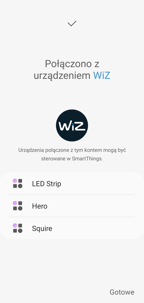 Po dodaniu urządzeń w aplikacji WiZ, możemy przystąpić do połączenia usług WiZ i SmartThings. Przechodzimy do aplikacji SmartThings, aby dodać urządzenie do inteligentnego domu. Klikamy na ekranie głównym przycisk Dodaj ( + ), w prawym górnym rogu ekranu. Następnie Dodaj urządzenie, przesuwamy w dół do sekcji marek Wybór z listy urządzeń, wybieramy markę WiZ i wybierz Powiąż konto. Kontynuujemy pierwsze kroki, wybierając lokalizację i pokój dla urządzenia. Zostaniemy przeniesieni na stronę internetową WiZ, gdzie wpisujemy wcześniej skopiowany kod aktywacyjny, klikamy strzałkę. Zostaniemy poinformowani o zidentyfikowaniu i potwierdzamy połączenie z ekosystemem SmartThings, klikając Kontynuuj. Zostaniemy poinformowani o udanym połączeniu usług WiZ i SmartThings. Zamykamy iksem w lewym górnym rogu stronę internetową i po chwili pokaże nam się lista wszystkich urządzeń z aplikacji WiZ. Klikamy Gotowe, znalezione urządzenia pojawią się w wybranym wcześniej pokoju, jeśli tak się nie stanie szukaj ich w sekcji nieprzypisanych do żadnego z pokoi.