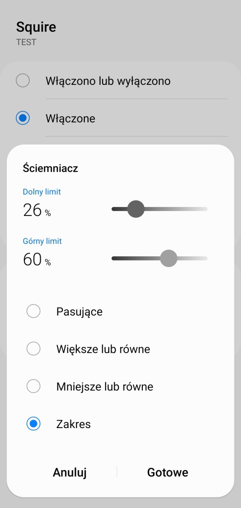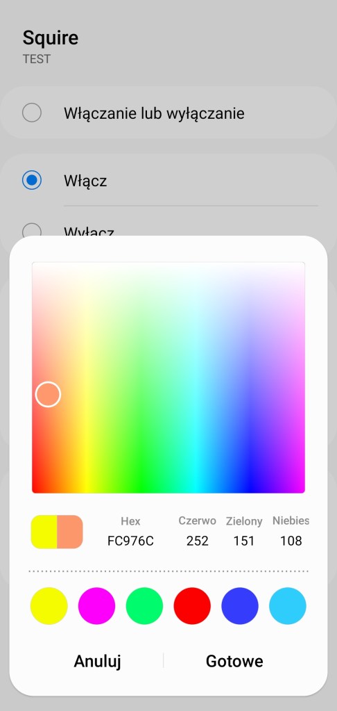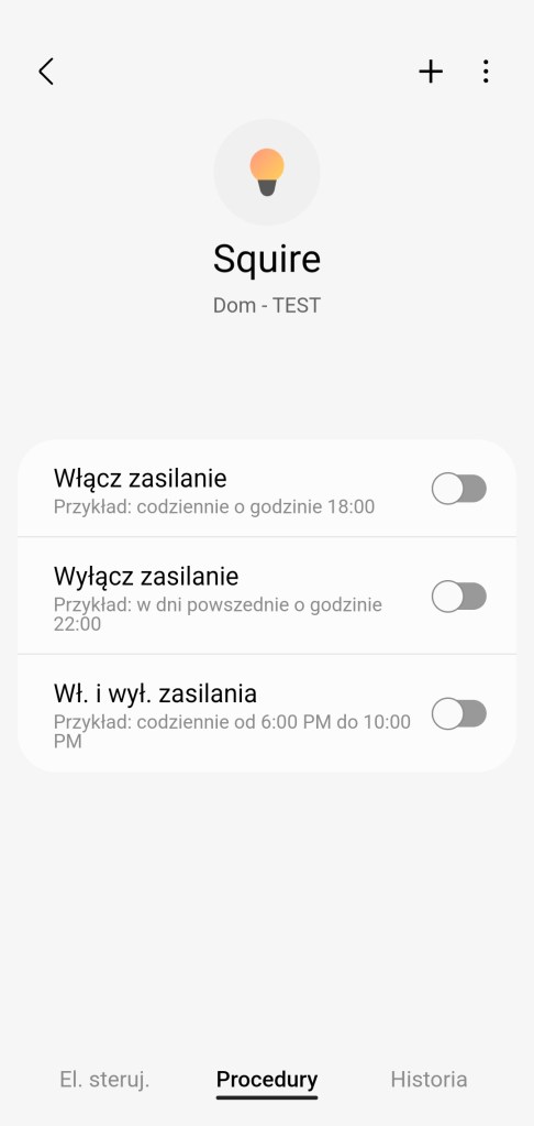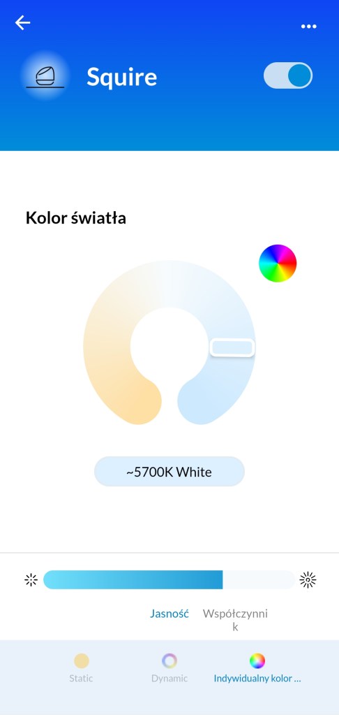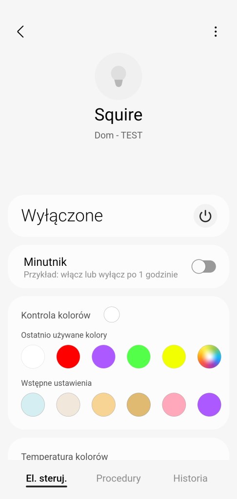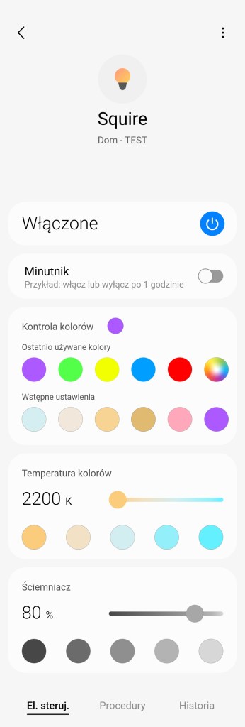 W głównym panelu aplikacji mamy możliwość włączenia/wyłączenia lampy Squire WiZ, możliwość ustawienia minutnika. Poniżej posiadamy możliwość ustawienia dowolnego koloru z palety barw RGB, jak i pięć ostatnio używanych kolorów oraz sześć sugestii. Kolejna belka umożliwia ustawienie temperatury światła w zakresie 2200 K – 9000 K, zakres jest błędny ponieważ w specyfikacji mamy możliwość 2200 K – 6500 K temperatury światła. Ostatnia opcja pozwala na ustawienie ściemniacza od 1 do 100%. Pod ściemniaczem posiadamy również pięć kół, będących przyciskami ustawiającymi ściemniacz na kolejno od lewej 10%, 30%, 50%, 70% oraz 90% jasności. Na dole znajdziemy sekcję panel „Procedury” znajdziemy tutaj szybkie procedury: włączenia i wyłączenia urządzenia o danej porze dnia oraz listę procedur gdzie używane jest urządzenie. Panel „Historii” nie różni się znacznie od innych urządzeń, mamy dostęp do sortowania i przestudiowania historii działań lampy. W ustawieniach „Edytuj” mamy standardową możliwość zmiany nazwy, lokalizacji, pomieszczenia oraz możliwość dodania do panelu „Ulubione”.