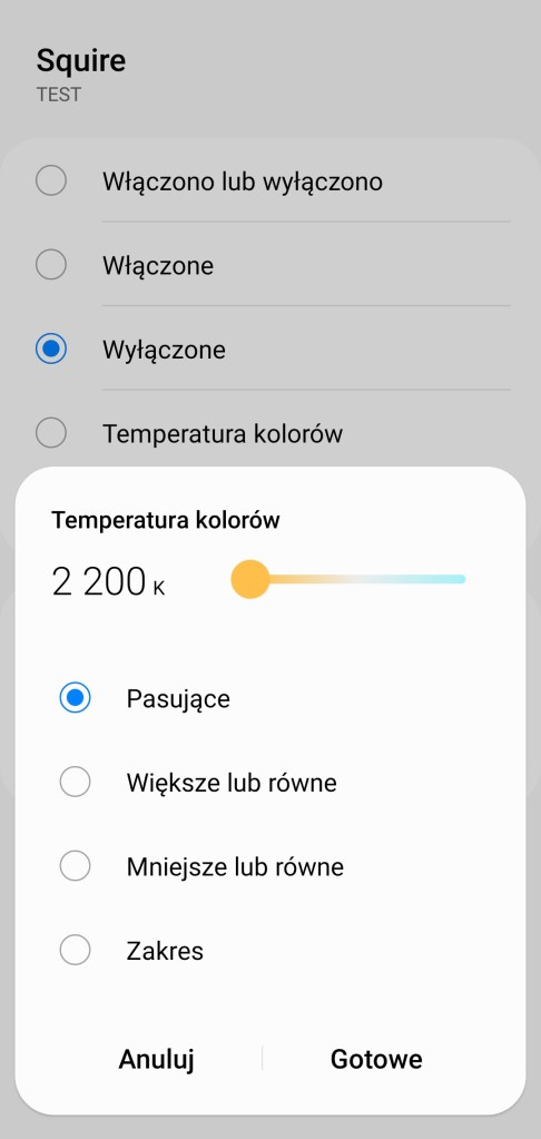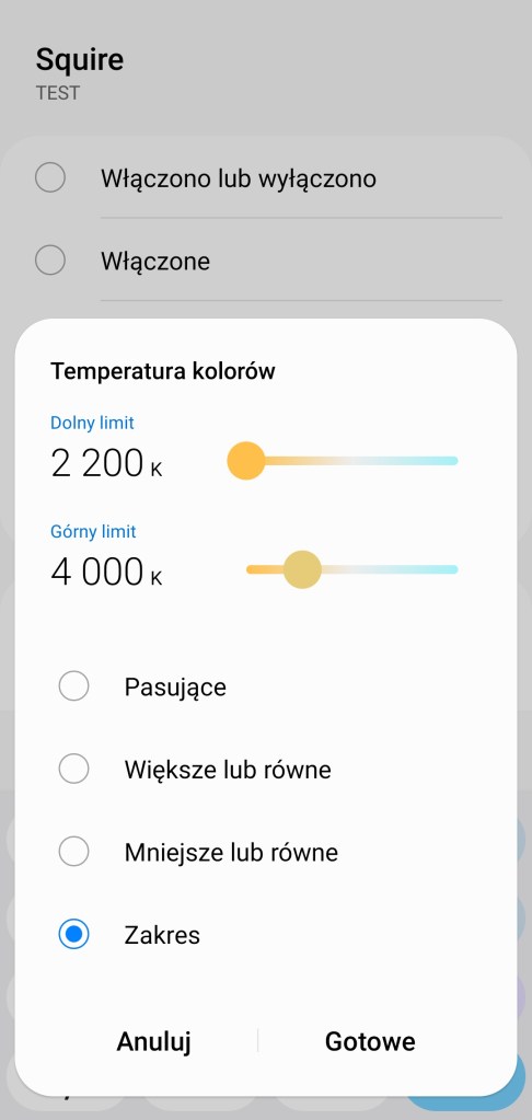 Tworzenie procedur (dawniej automatyzacje) „Jeśli … to Wtedy” musimy podzielić na dwa etapy, ponieważ znacznie różnią się dostępne opcje, jeśli inicjujemy warunek „Jeśli”. W pierwszej możliwości „Jeśli” urządzenie pozwala na wybranie opcji „Włączono lub wyłączono” czyli zmiana stanu, oraz „Włączone” i „Wyłączone”. Poniżej mamy wartość ściemniacza i temperatury kolorów z zakresu 2200 – 9000 K. Zakres temperatury kolorów jest błędy, lampa LED pozwala uzyskać 2200 K – 6500 K. Możemy ustawić również zakres tych wartości. Dodatkowo posiadamy opcję jak długo zachowany powinien być stan przed uruchomieniem automatyzacji oraz czy ma być to warunek wstępny. W drugiej możliwości „Wtedy”, świeczka pozwala na dużo więcej, mamy pełną możliwość tworzenia opcji przydatnych w programowaniu już np. scenerii. Mamy ponownie opcje „Włączono lub wyłączono” czyli zmiana stanu, oraz „Włączone” i „Wyłączone”. Ustawienie jednego z kolorów, jasności lampy z zakresu 0 – 100%, bądź temperatury barwy z zakresu 2200 – 9000 K. Tutaj również pojawia się ze zbyt dużym zakresem temperatury świetlnej. Akcję uruchomienia lampy możemy opóźnić o dowolny czas, jak i wyłączyć ją automatycznie po ustalonym czasie.