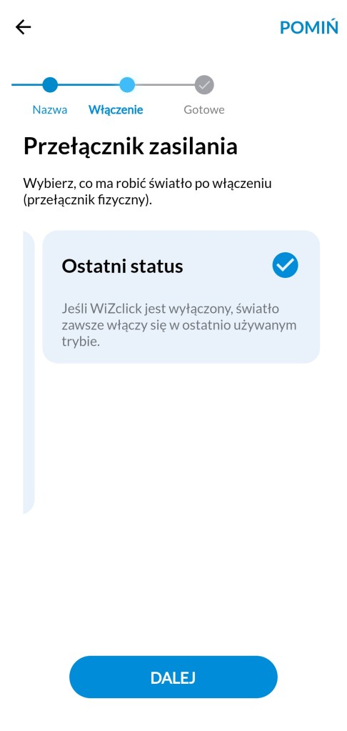 W ustawieniach lampy WiZ, w aplikacji producenta, znajdziemy ciekawą opcję o nazwie „WiZclick”. Dzięki niej posiadamy możliwość ustawienia co się stanie po przywróceniu zasilania w gniazdku zasilającym. Posiadamy dwie opcje dla pierwszego włączenia zasilania oraz dla dwukrotnego szybkiego przełączenia włącznika ściennego. Dla każdej z opcji możemy ustawić swój ulubiony kolor. Dodatkowo możemy zrezygnować z tej opcji i lampy po prostu zapamięta ostatni używany kolor.