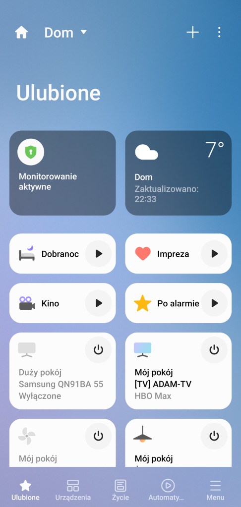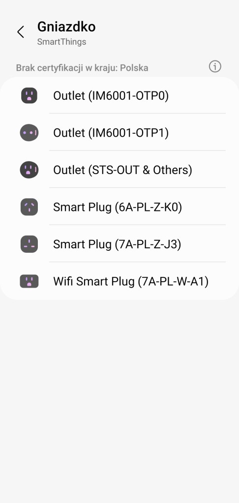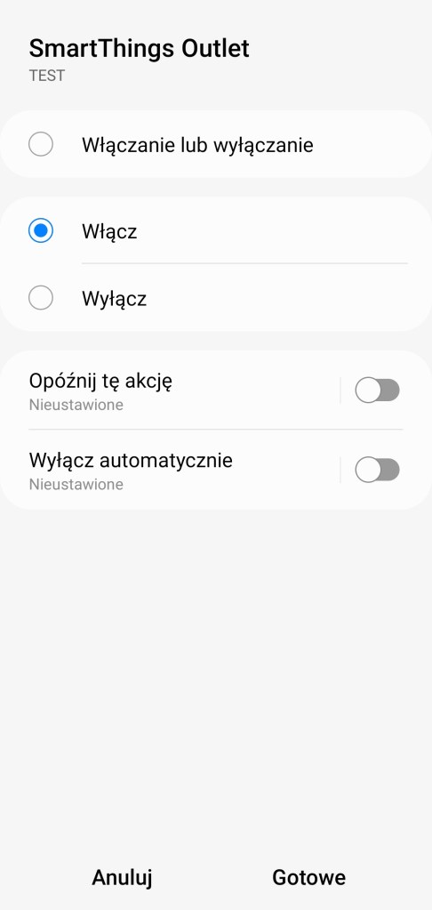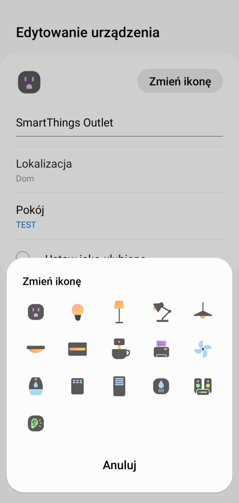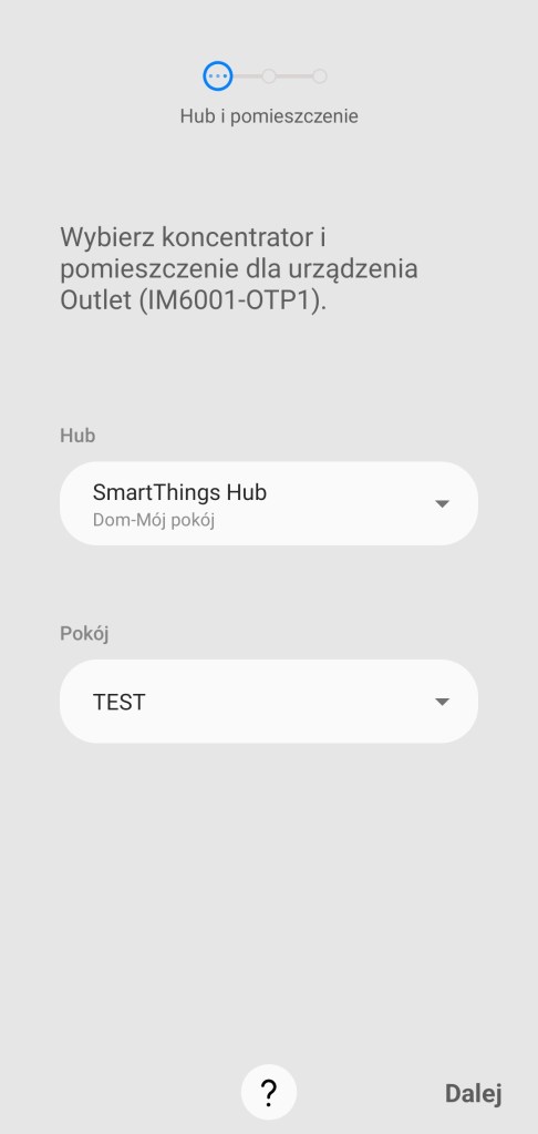Dodanie do ekosystemu SmartThings jest niezwykle proste, wystarczy korzystać z polecań na ekranie. Przechodzimy do aplikacji SmartThings, na ekranie głównym aplikacji, klikamy Dodaj ( + ) znajdujący się w prawym górnym rogu ekranu, kolejno Urządzenie, przesuwamy w dół do sekcji marek Wybór z listy urządzeń, znajdujemy markę SmartThings, a później Gniazdko. Wybieramy model wtyczki w naszym wypadku to Outlet (IM6001-OTP1), klikamy Rozpoczęcie, uruchamiając tym samym proces konfiguracji. Kontynuujemy pierwsze kroki, wybierając centralę i pomieszczenie dla nowego urządzenia. Podłączamy inteligentne gniazdko do zasilania, dioda na urządzeniu zacznie migać. Po chwili zostanie znaleziona wtyczka i dodana do inteligentnego domu. Możemy zmienić nazwę gniazdka, jej ikonę lub dodać do panelu „Ulubione”, zatwierdzamy zmiany wybierając Zapisz. Kończymy proces instalacji, klikając Gotowe.